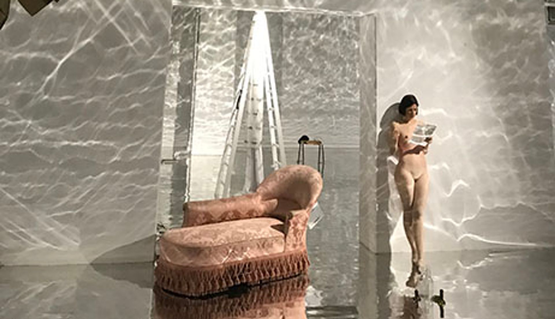 Jung was resplendent in a flesh-toned ‘nude’ body suit adorned with twinkling nipples that she has worn for previous performances. Here, she assumed the role of Frau Welt, a world weary, mentally disintegrating grande dame, reclining on a powder pink chaise longue and being served mimed drinks by a solicitous manservant—who is in fact the artist’s real-life partner. With a characteristically complex, wide-ranging monologue rich in references, word play, asides and tone changes, Jung offered a potent taster of what was later to come in the full version of the piece. At one point she underlined the fragility of her character by breaking into a fragment of the Patsy Cline's 1961 classic I Fall to Pieces, with her punning word associations including the positing of the Lacanian question, “are we at the mirror stage?” before answering herself with the literal observation, “we are on the mirror stage!”.