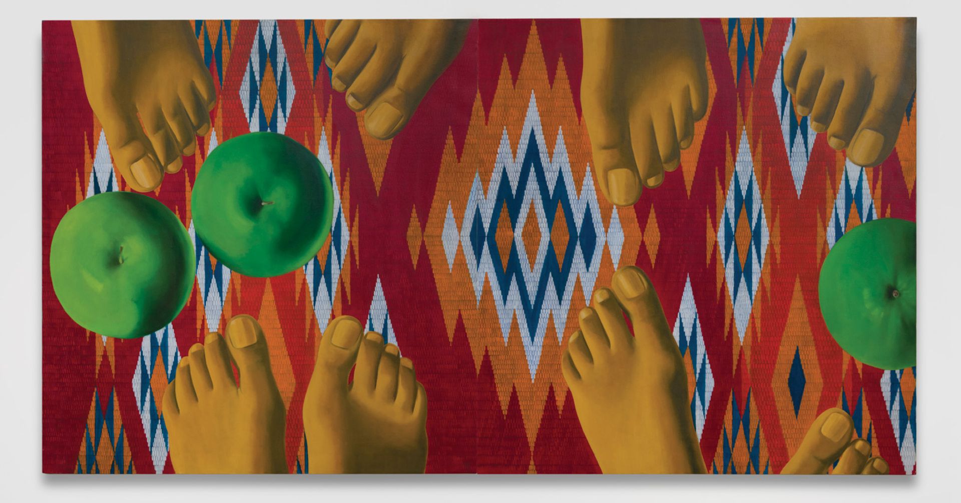 During her long life, Hurtado has moved through diverse styles and artistic scenes. “Luchita has always had this very fluid identity,” Hans Ulrich Obrist, the curator of her Serpentine survey, recently told the New York Times. Her Hauser & Wirth show, Dark Years, revealed her experimentation with abstract biomorphic and landscape forms, while in Made in L.A. 2018 she presented crisply rendered paintings from the 1960s and 1970s featuring parts of her body against Native American rugs, and another series showing feathers floating in the sky, inspired by a fire ritual she once witnessed.