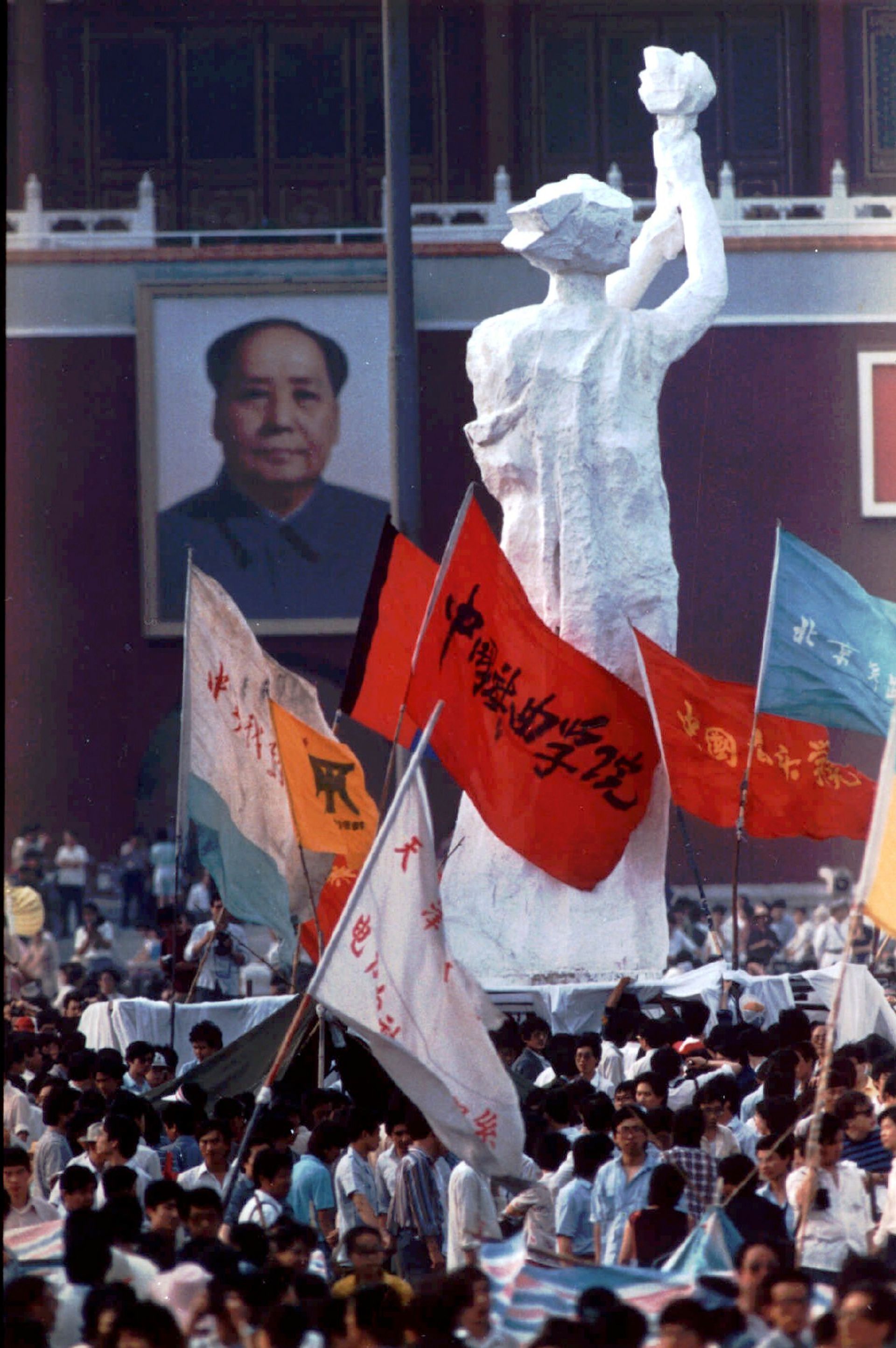 A statue dubbed The Goddess of Democracy made by students from the Central Academy of Fine Arts faces off against a portrait of Mao Zedong in Beijing's Tiananmen Square, on 30 May 1989 © AP Photo/Jeff Widener