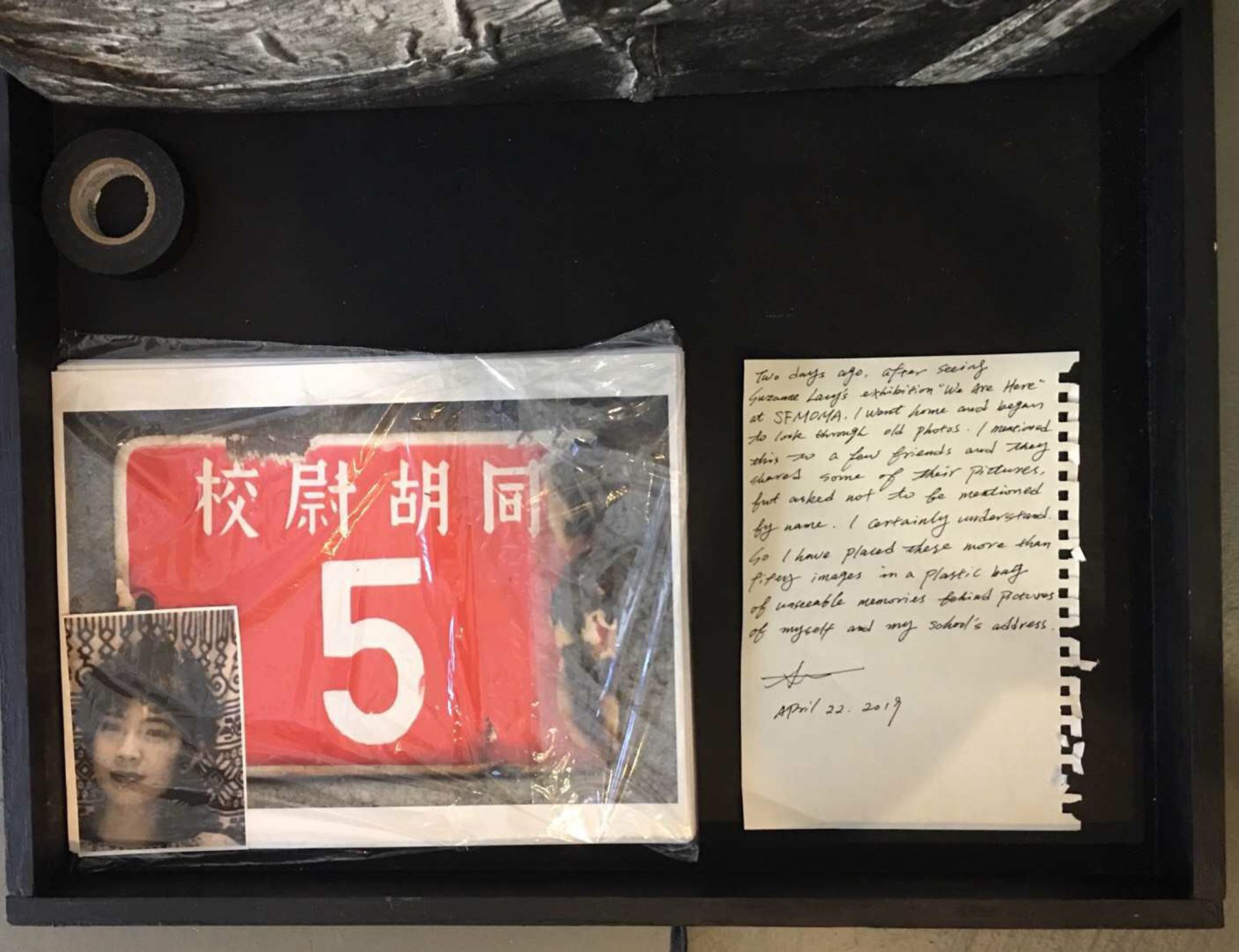 After graduation, Zhang left for Japan and then the US. However, she will never forget those days, and hopes that others will remember, also, through a piece of art she has included as part of the group exhibition Present Tense 2019: Task of Remembrance (through 21 December) at the Chinese Cultural Center of San Francisco. Zhang’s installation Sealed Memory (2019) takes up one wall, and consists of two blackened panels taped to the wall by long strips of black tape, with a box below containing images collected from her friends and fellow students. The show addresses other historic political upheavals as well, such as the fall of the Berlin Wall and the 2016 US Presidential election. Zhang spoke with us about the work and her experience at Tiananmen by phone.