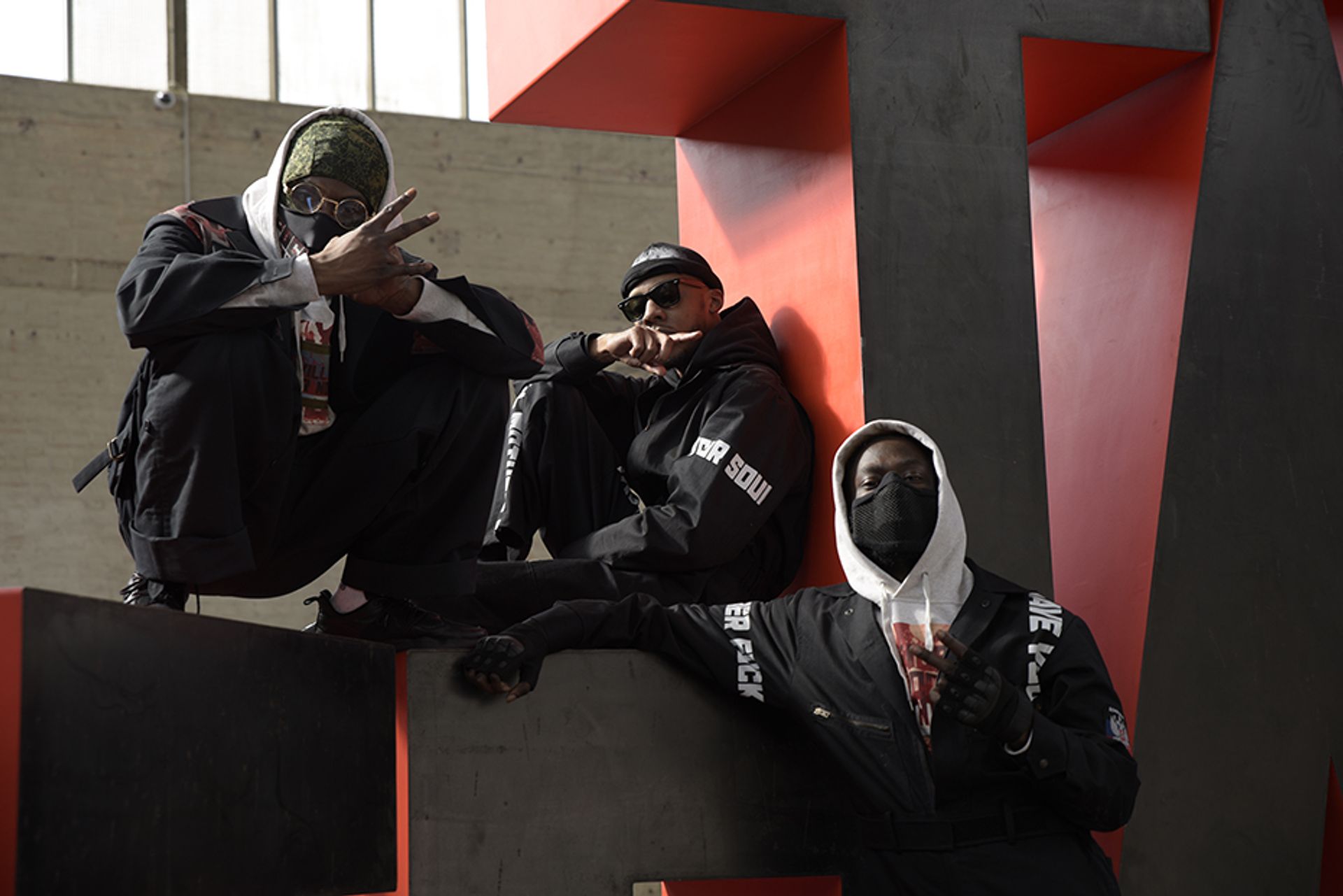 Skengdo, AM and Drillminister in front of Andrei Molodkin's Young Blood (2019) © Gleb Kosorukov & a-political