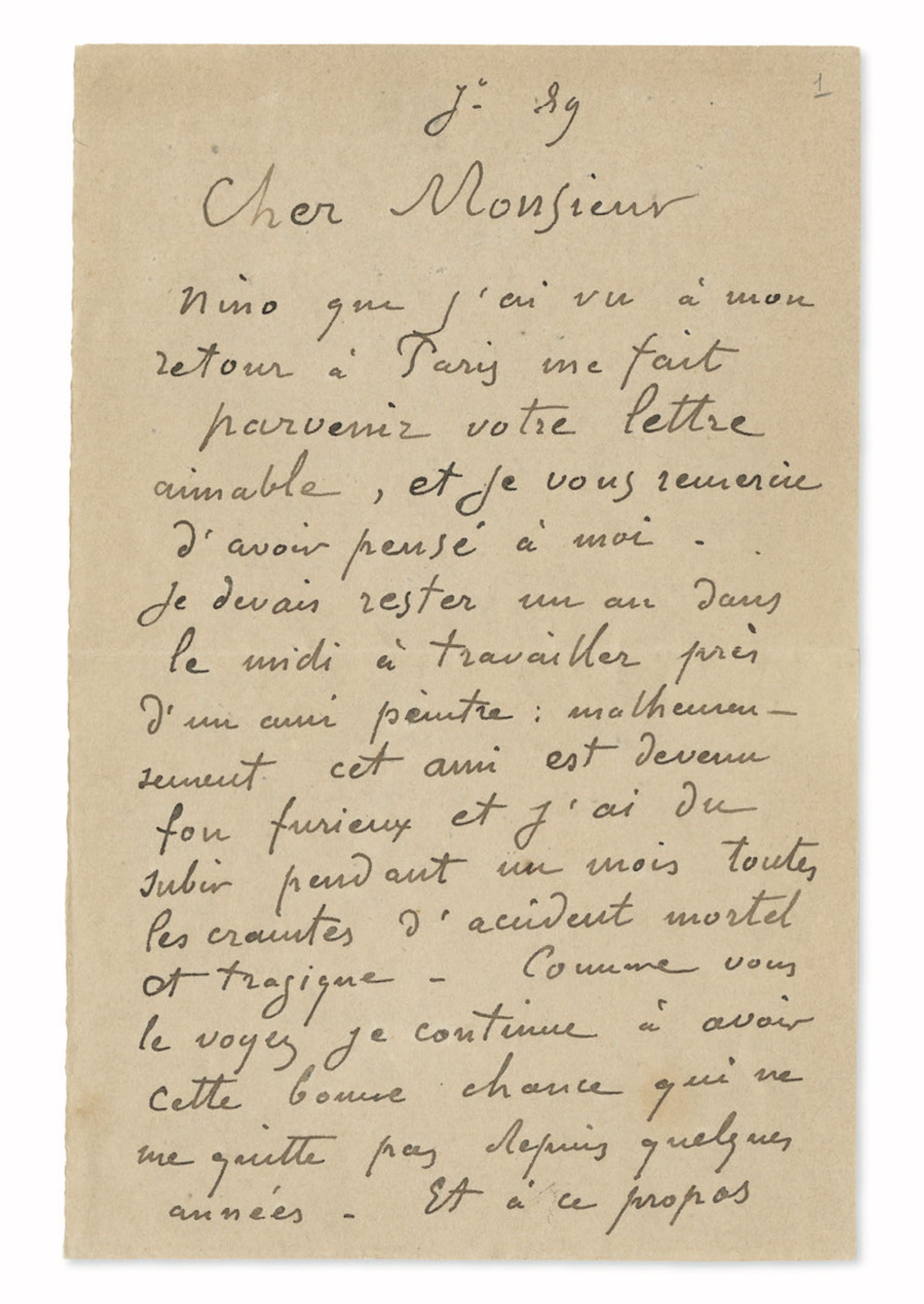 In the letter, written on his return to Paris, Gauguin appears to absolve himself of any responsibility for the tragedy that unfolded on 23 December 1888. That evening the two artists, who were working together in Arles, had a row. Gauguin stormed out of the Yellow House and years afterwards he claimed that Van Gogh had run after him, aggressively confronting him and carrying an open razor. This later account may have been embellished.