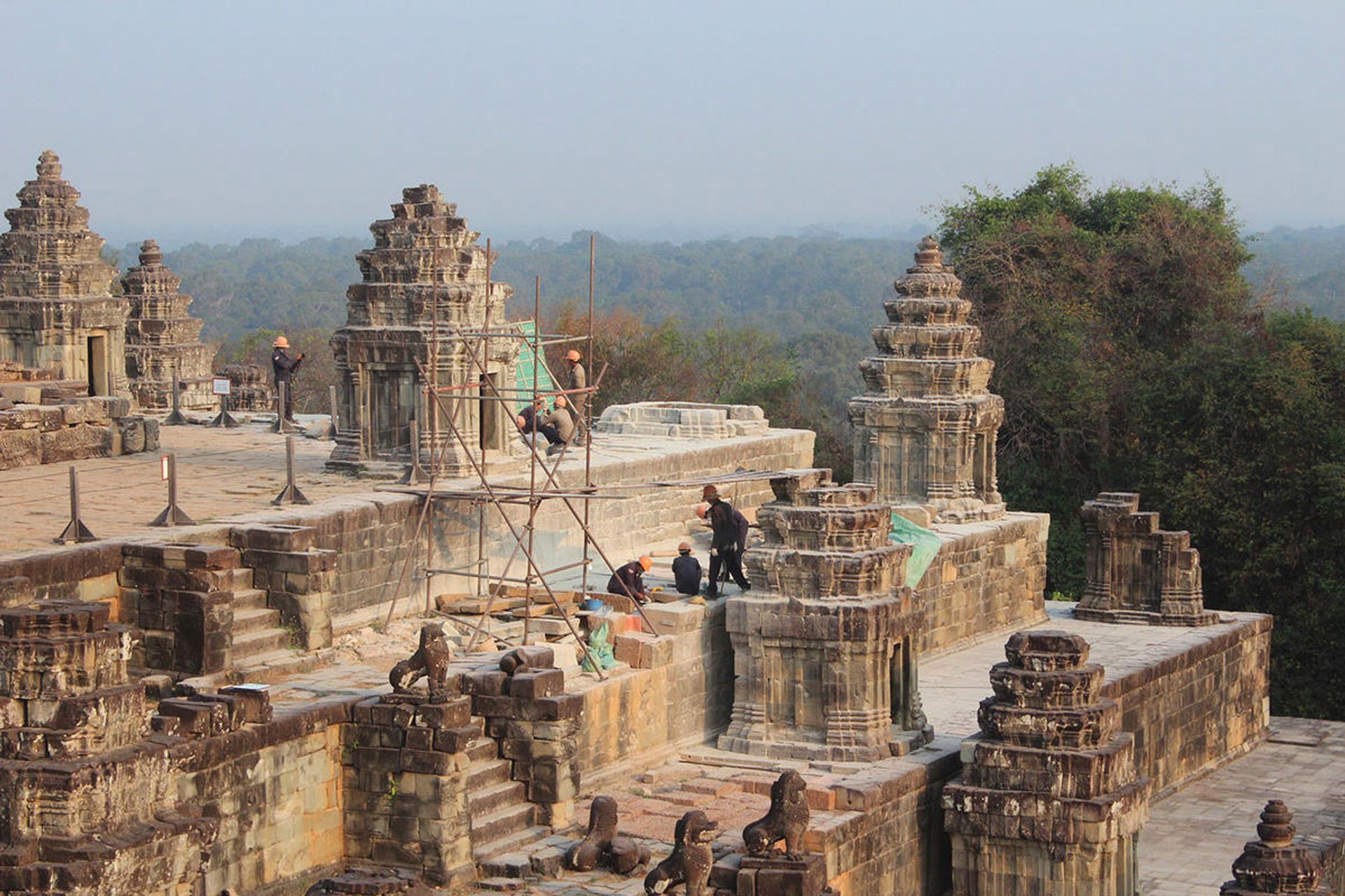 Using two cranes, a team of 80 to 90 conservation technicians removed hefty terrace stones–some weighed as much as 600 pounds–and waterproofed the foundation by laying a PVC membrane atop the dirt, Ackerman says. Then the stones were cleaned and put back, sometimes with slight retooling, along with new stones retrieved from the side of the hill at Phnom Bakheng and inserted in places where stones had been lost.