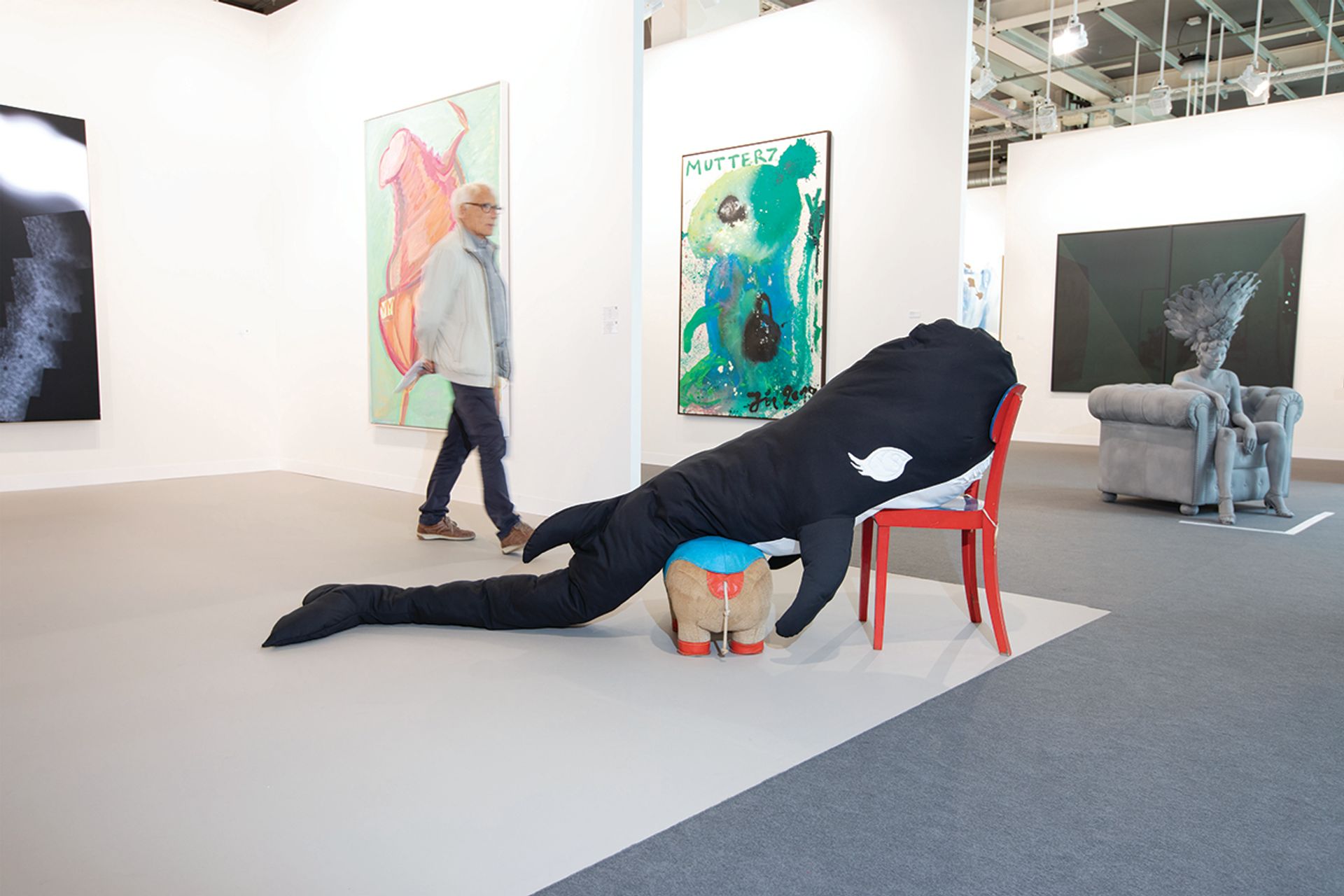 Cosima von Bonin, Killer Whale with Long Eyelashes I (Rhino version) (2018); Rhino by Renate Müller, Germany (1960s), Petzel: “She’s a very good artist, this gallery has a lot of artists that I like. The piece incorporates a rhino made by Renate Müller, who made educational and therapeutic toys for children in East Germany, with Cosmia’s whale. I like it because [Von Bonin combines] an object by a creator who had specific reasons for making her works [that was not art]. Artists really like Renate’s pieces. I also like that Cosima combined the soft whale with the semi-hard rhino. The fact that she’s a woman interests me too. I think women have a perspective on art that men are unable to have for cultural reasons. So, it expands the perception.” © David Owens