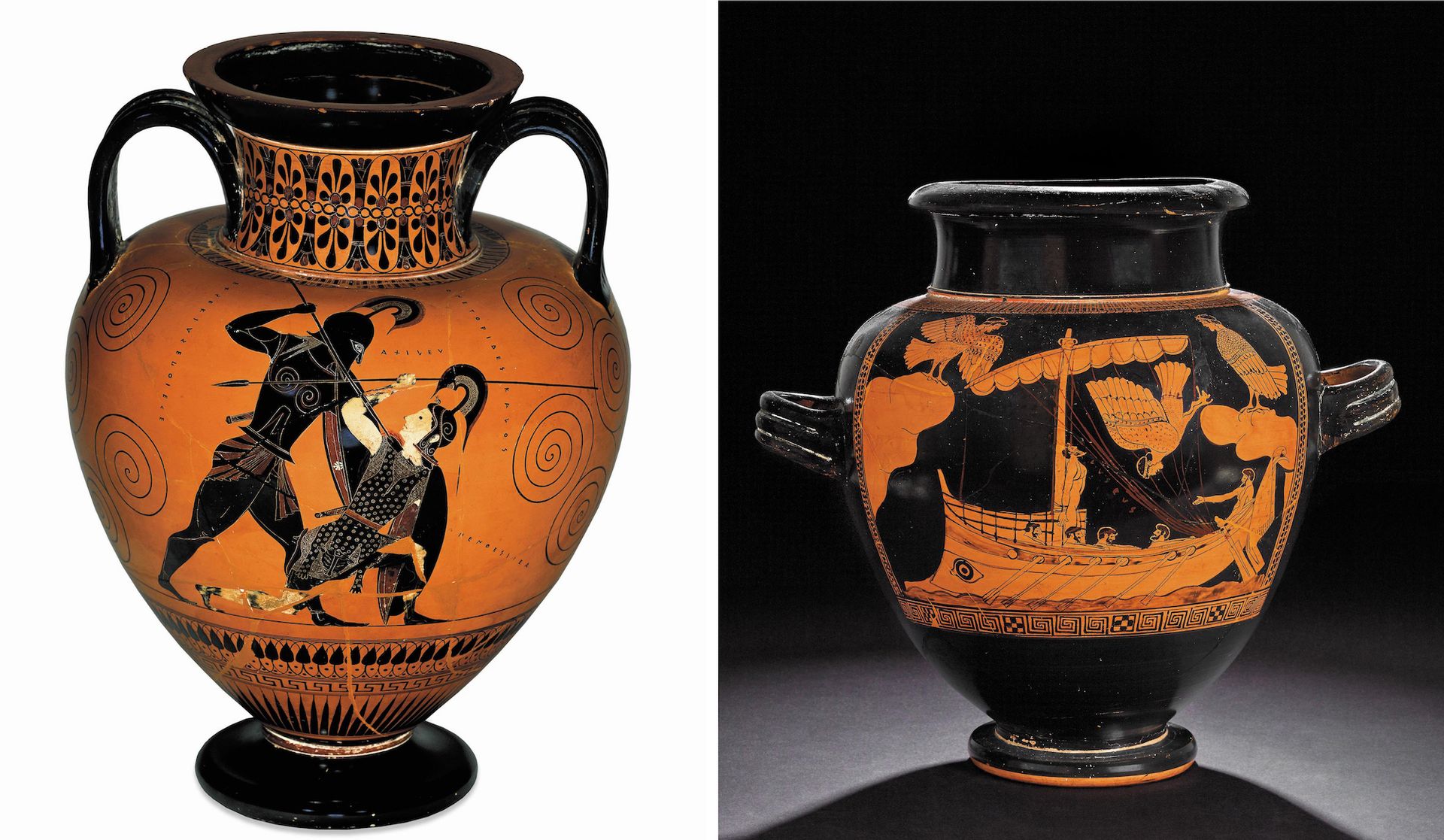 Achilles kills the Amazon queen Penthesilea, Athenian amphora, around 530BC and Odysseus and the Sirens, Athenian jar, around 480-470BC both © The Trustees of the British Museum