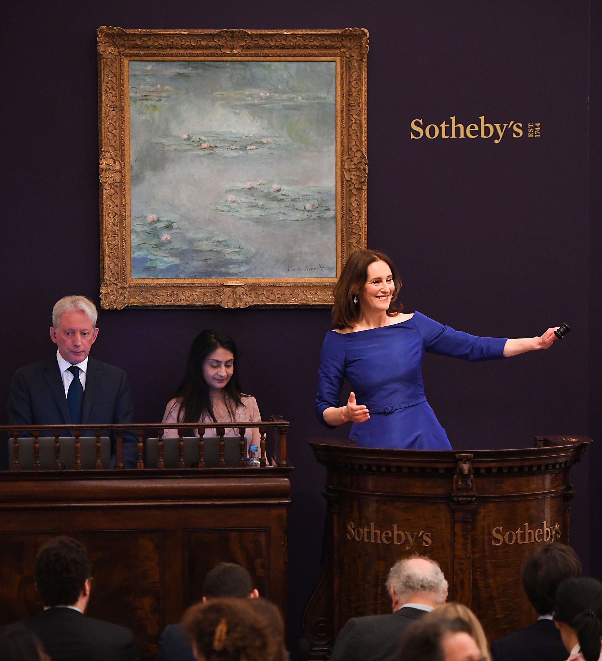 Auctioneer Helena Newman in front of Monet's waterlilies scene Nymphéas (1908) Courtesy of Sotheby's