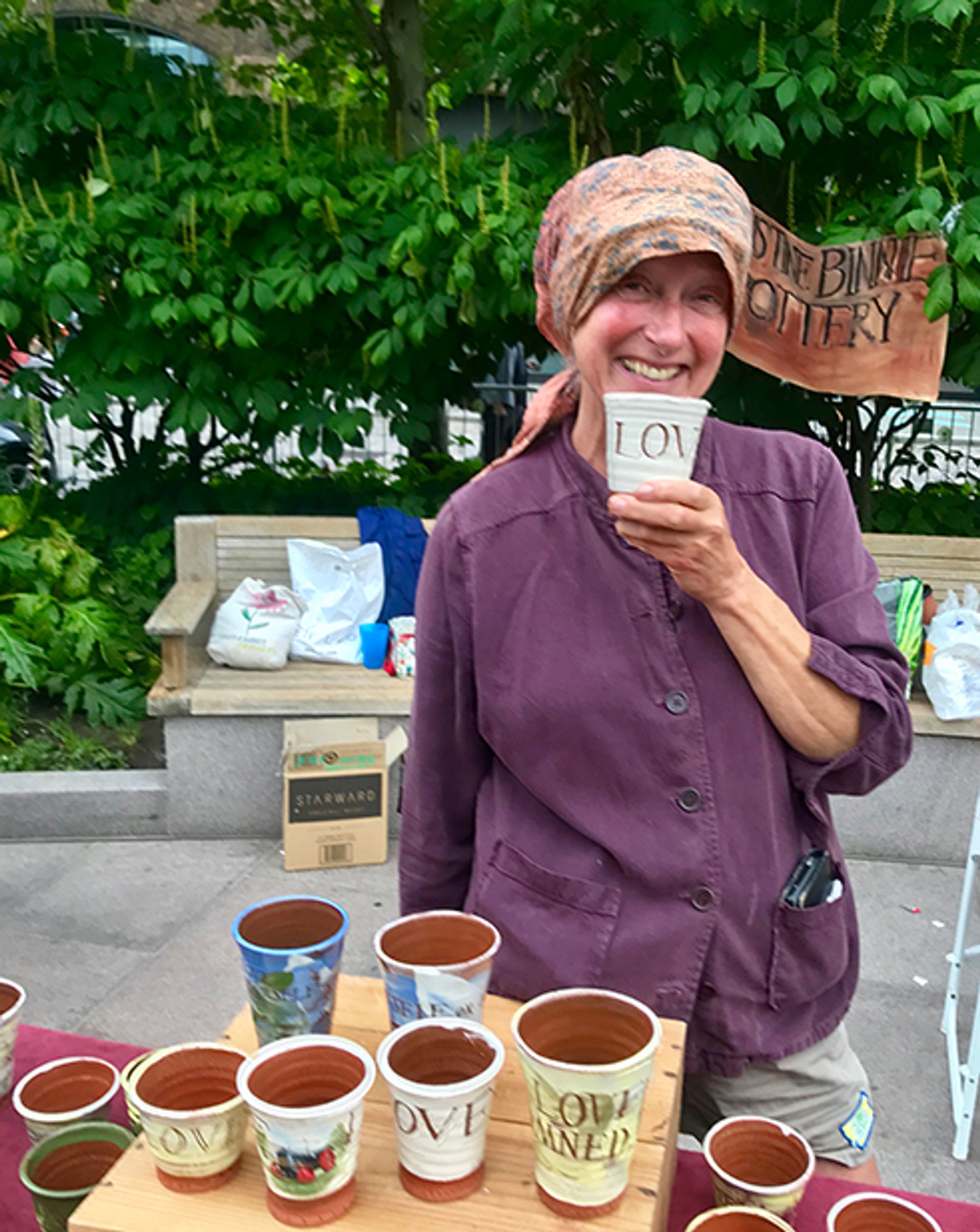 Love was all around yesterday at the midsummer edition of The Art Car Boot fair. Offering an antidote to our decidedly unlovely times, the event took 'love'—“love for the Planet, love for each other and of course, a love of art”—as its theme. More than 120 artists parked up in Lewis Cubitt Square, King’s Cross to sell their most lovely wares. Christine Binnie’s ceramic loving cups sold alongside her sister Jennifer Binnie’s painted celebrations of the female sex. Then there were the family love-ins of Bob and Roberta Smith, Jessica Voorsanger and their children Etta and Fergal, all of whom were selling their own work, with Jessica’s portraits of famous artist couples available singly or as a duo.