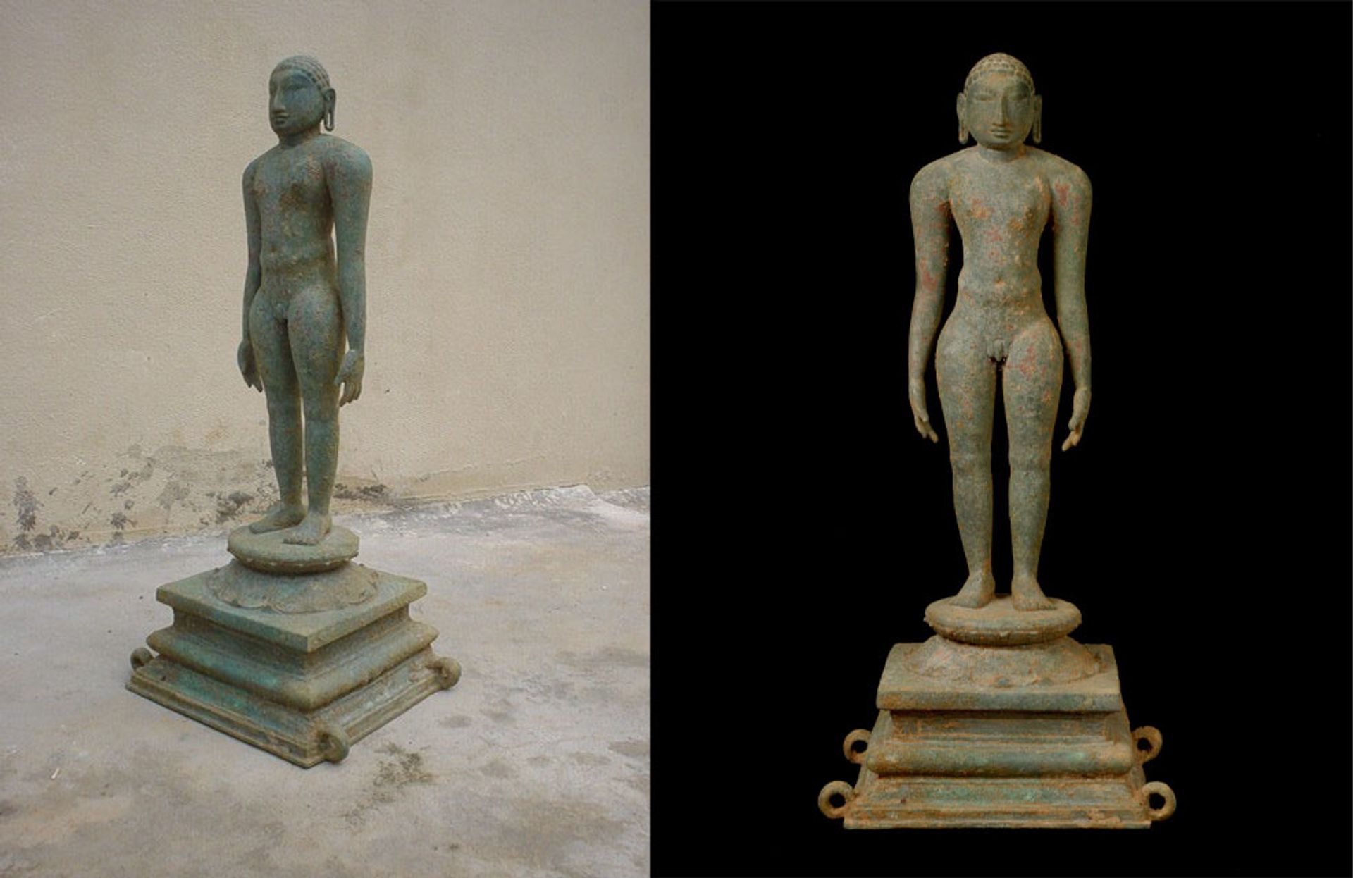 A bronze Standing Jina, from Tamil Nadu, India, Chola period, 12th Century, 29 1 /4 in high. Valued at $750,000.00. The first photo shows the Standing Jina outdoors, "its surface is corroded and covered in loose dirt as if it had only just been dug out of the ground", the government's complaint reads. A 2004 email recovered from one of Kapoor's computers described the work's discovery when a local dug a pond to raise fresh water fishes, and its trail "through four or five hands", to an associate of Kapoor's who has been arrested for his connection to temple thefts. According to authorities, "any antiquity exported without the knowledge and authorization of the Republic of India would be exported illegally". The second photo shows the work post-restoration. It was sold to an unnamed private collector in 2005 for "an undervalued purchase price to avoid taxes", according to authorities.