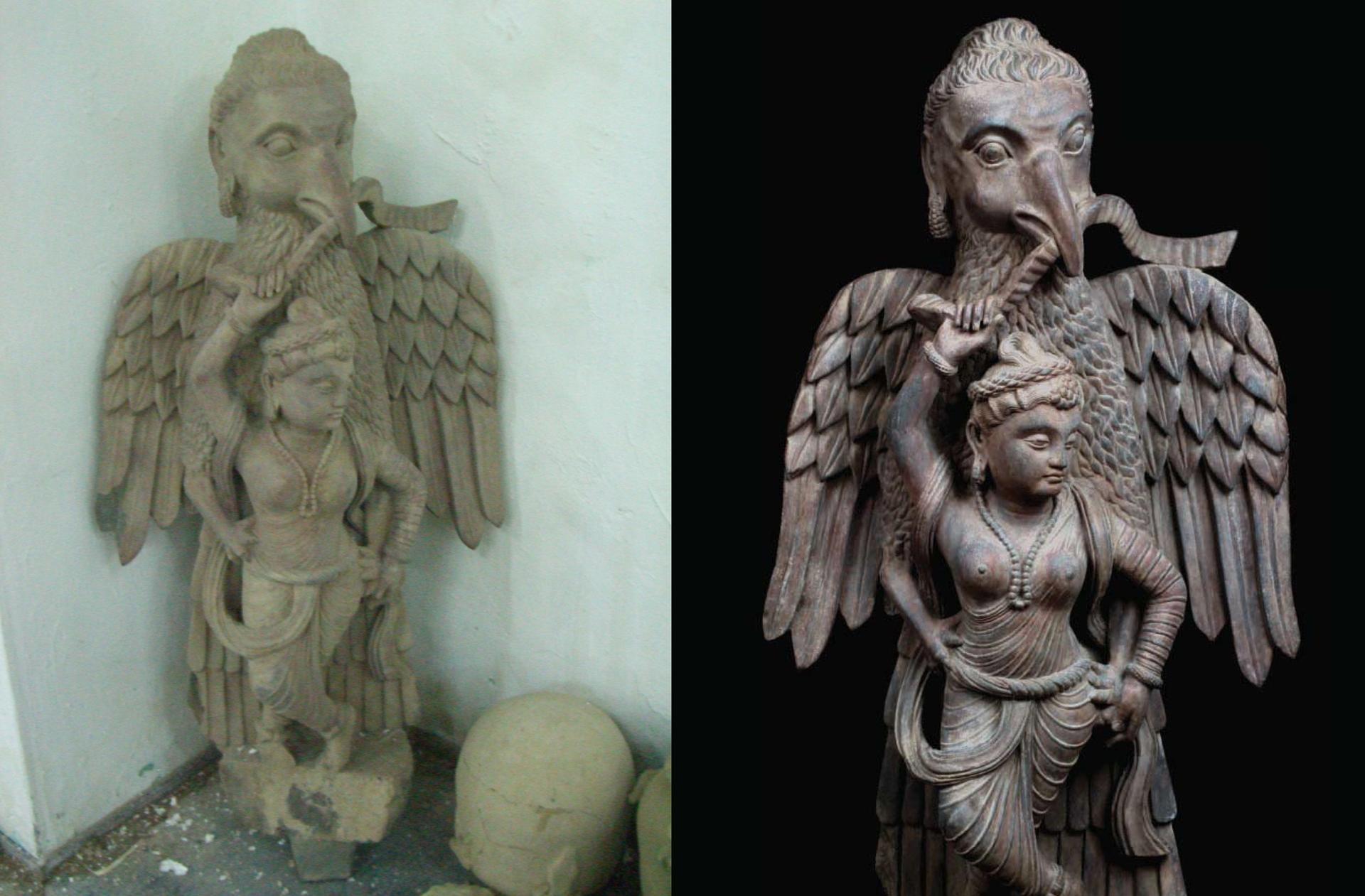 A grey schist Garuda Seizing a Nagini with traces of original red gesso, from the region of Gandhara, Kushan Period, 2-3rd century, 33in high. Valued at $650,000.00. Authorities say the work was falsely declared as coming from India, while Gandhara was located in what is now Pakistan and Afghanistan