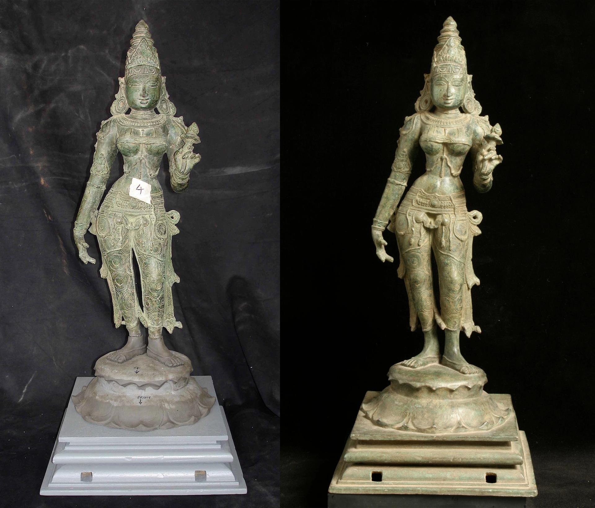 A copper alloy statue of Shivagami Amman, South India, Tamil Nadu, India, Late Chola Period, 13th century, 26in high, pre- and post-restoration. Valued at $1,750,000.