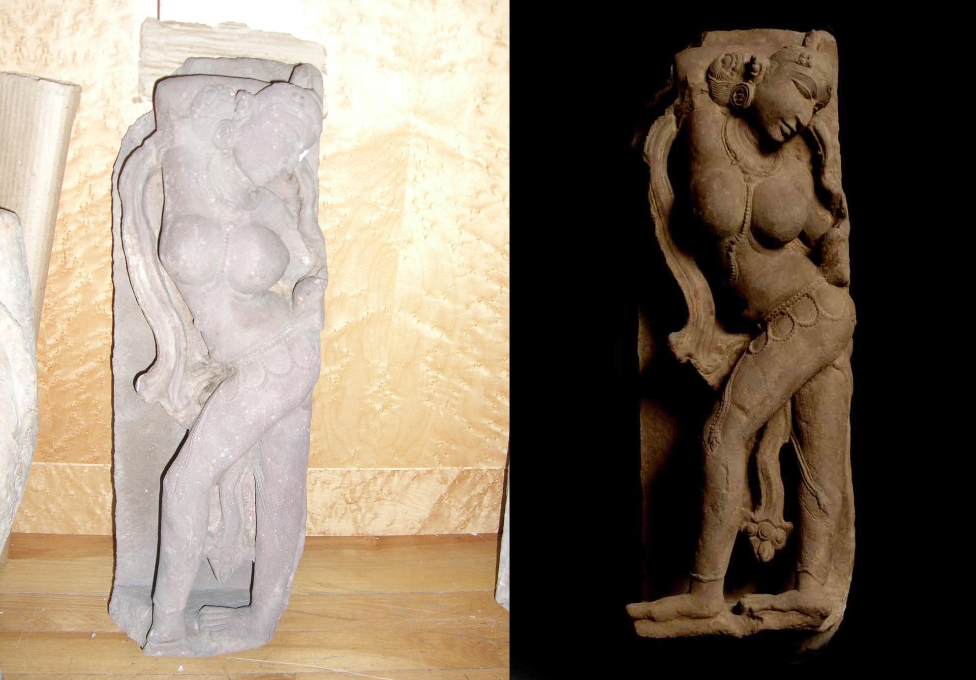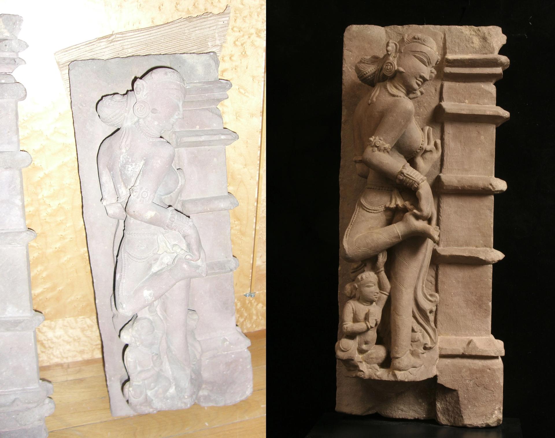 In 2006, nine antiquities stolen were stolen from the Vishnu Varaha Temple in Kari Talai, Madhya Pradesh, India, including a pair of asparas. Prior to their theft, the Archaeological Survey of Indian photographed the works, which were originally attached, and assigned them inventory numbers. The website Plundered Past published the photo and discussed the thefts in a post in 2013. DHS-HSI and DANY photographed the Pair of Apsaras at Sofia Storage, unit 733, in July 2012, but they had not yet been identified as stolen and were not seized.