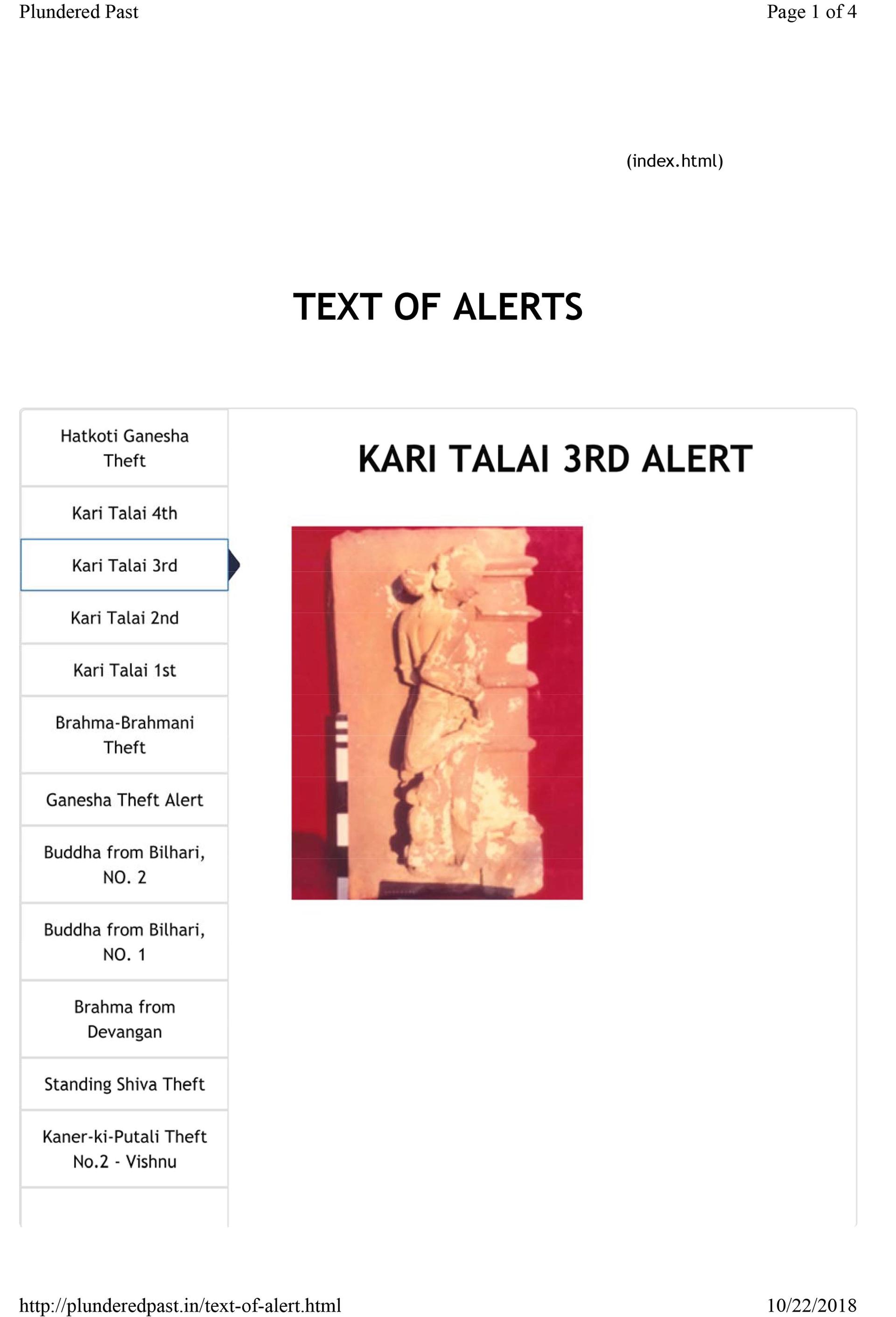 In 2006, nine antiquities stolen were stolen from the Vishnu Varaha Temple in Kari Talai, Madhya Pradesh, India. The ASI photographed the Celestial Figure at the Vishnu Varaha Temple in Kari Talai prior to its theft. The work was consigned to another dealer in Singapore and shipped through Hong Kong.
