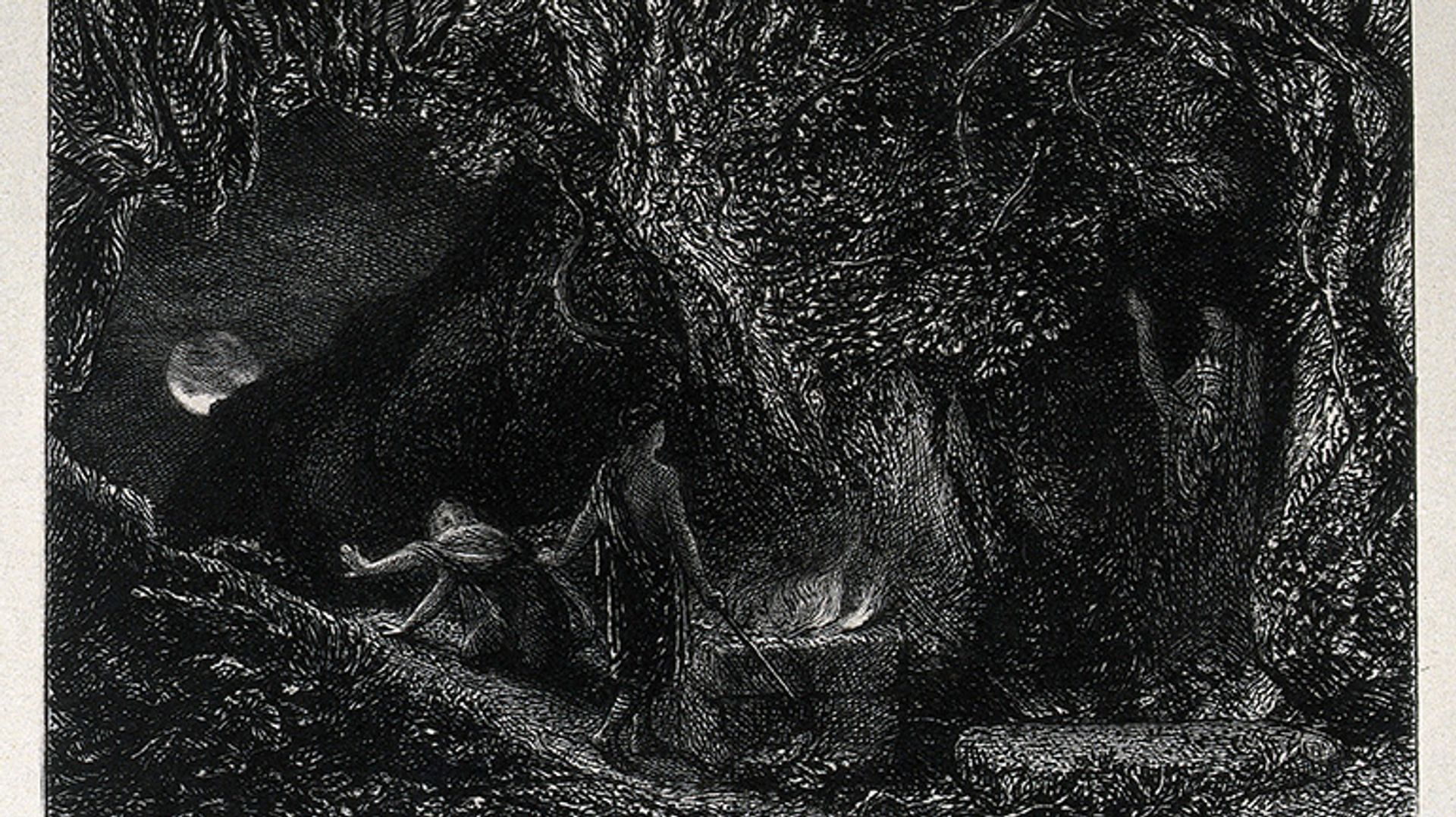S. Palmer and A.H. Palmer's A wizard and his accomplice performing incantations in a forest during a full moon (c.1860) © Wellcome Collection.