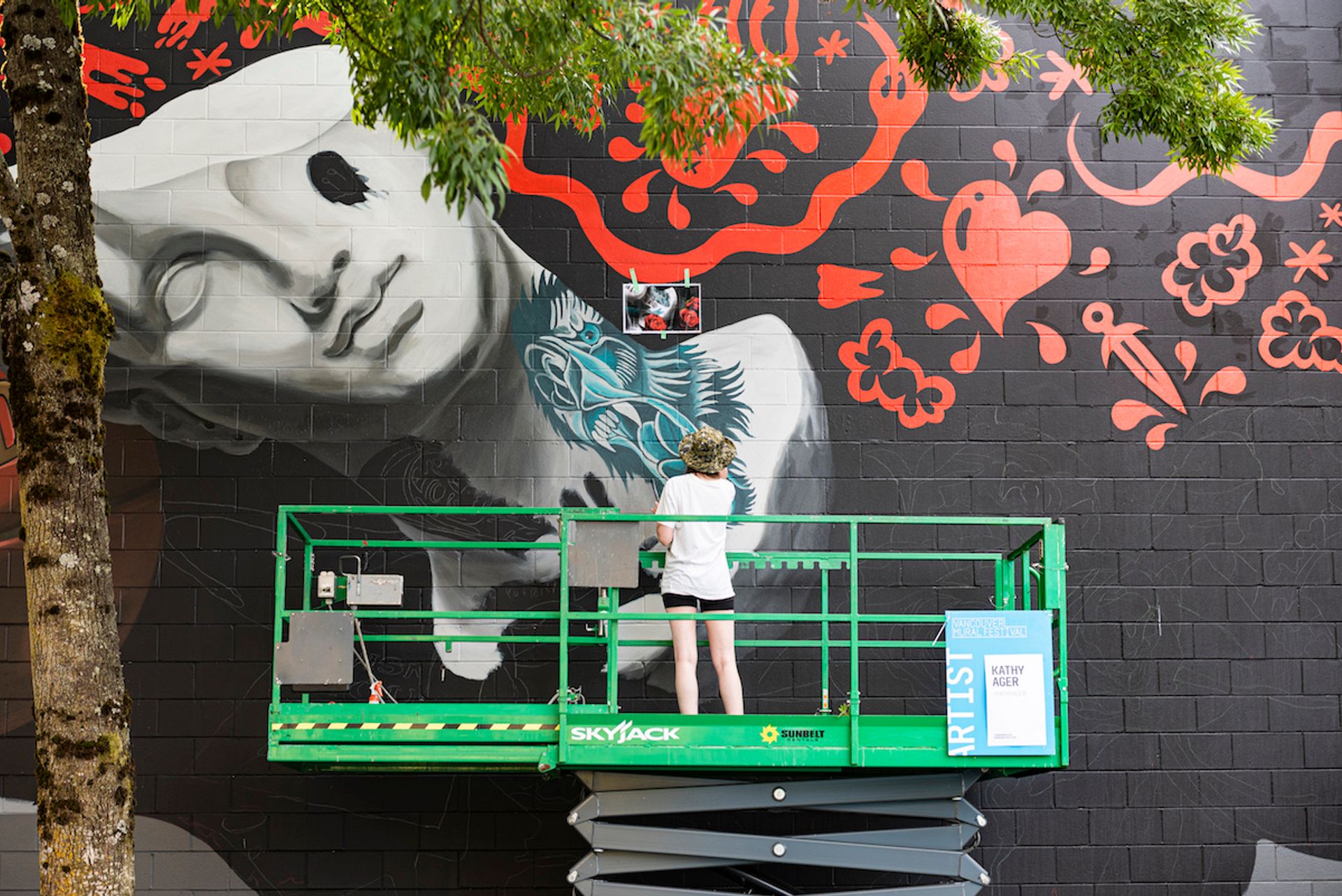 At the corner of 5th Avenue and Manitoba, the Canadian artist Kathy Ager is working on a mural called Homecoming. The work reflects the cultural influences of her travels between Vancouver, Lisbon and Amsterdam. Ager's painterly style—influenced in part by Dutch Masters, fashion and pop culture—provides intrigue on a quiet commercial street. Gabriel Martins