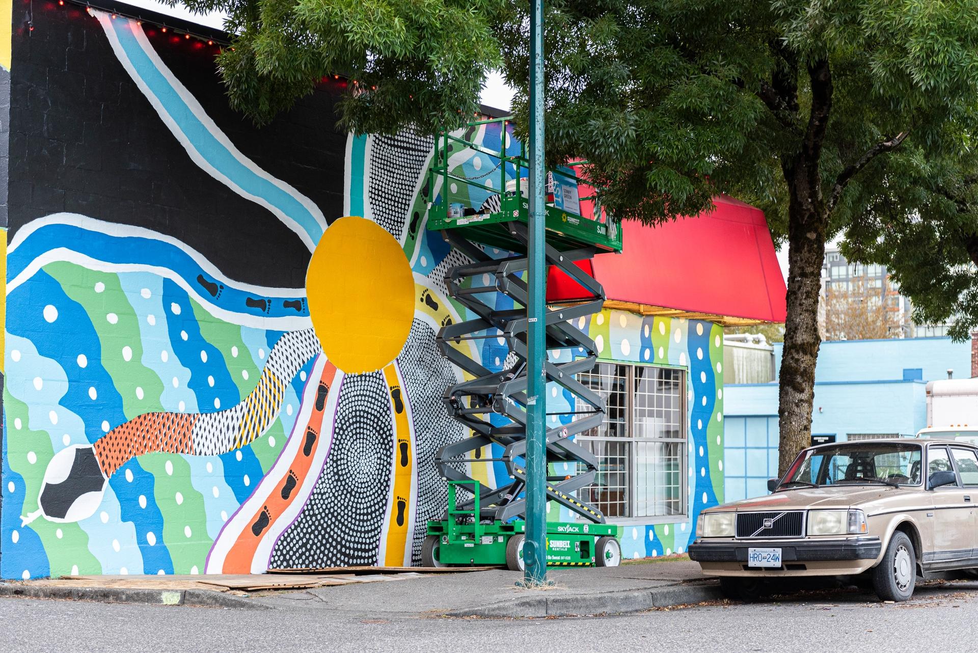 Outside A&B Party Rentals at 4th Avenue and Manitoba, the muralist Sony Green is painting an Aboriginal symbol for 'meeting ground'. The dotting represents variegated landscapes such as desert, flat lands, coastal areas and mountainous terrain. Gabriel martins