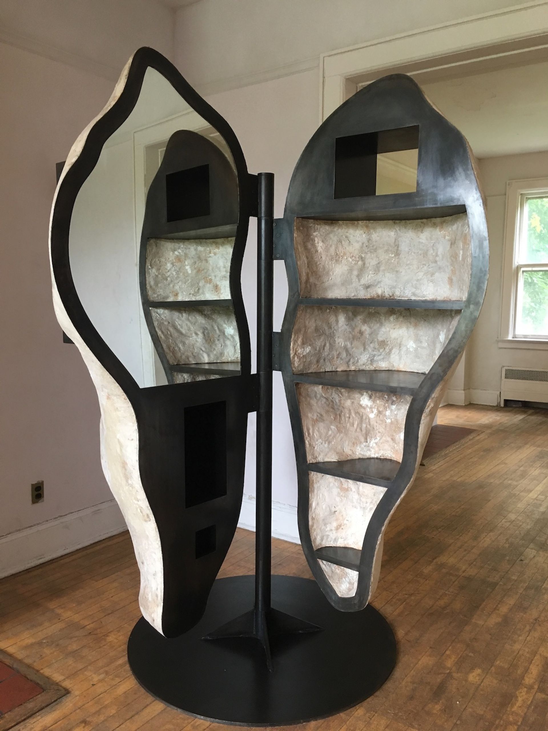 The Brooklyn-based sculptor, designer and architect has created a series of abstract but functional mixed-media pieces, such as this steel, paper and pulp armoire that resembles a caterpillar mid-metamorphosis, with a surface that appears to have been carved from organic materials. The artist also creates large-scale outdoor sculptures and earthworks, which he began experimenting with while in West Africa, where he learned about alternative architectural and sculptural methods. The artist also operates Shape Studio in Brooklyn, a design and fabrication shop known for undertaking eclectic projects. J McDonald, Cocoon Armoire, 2019