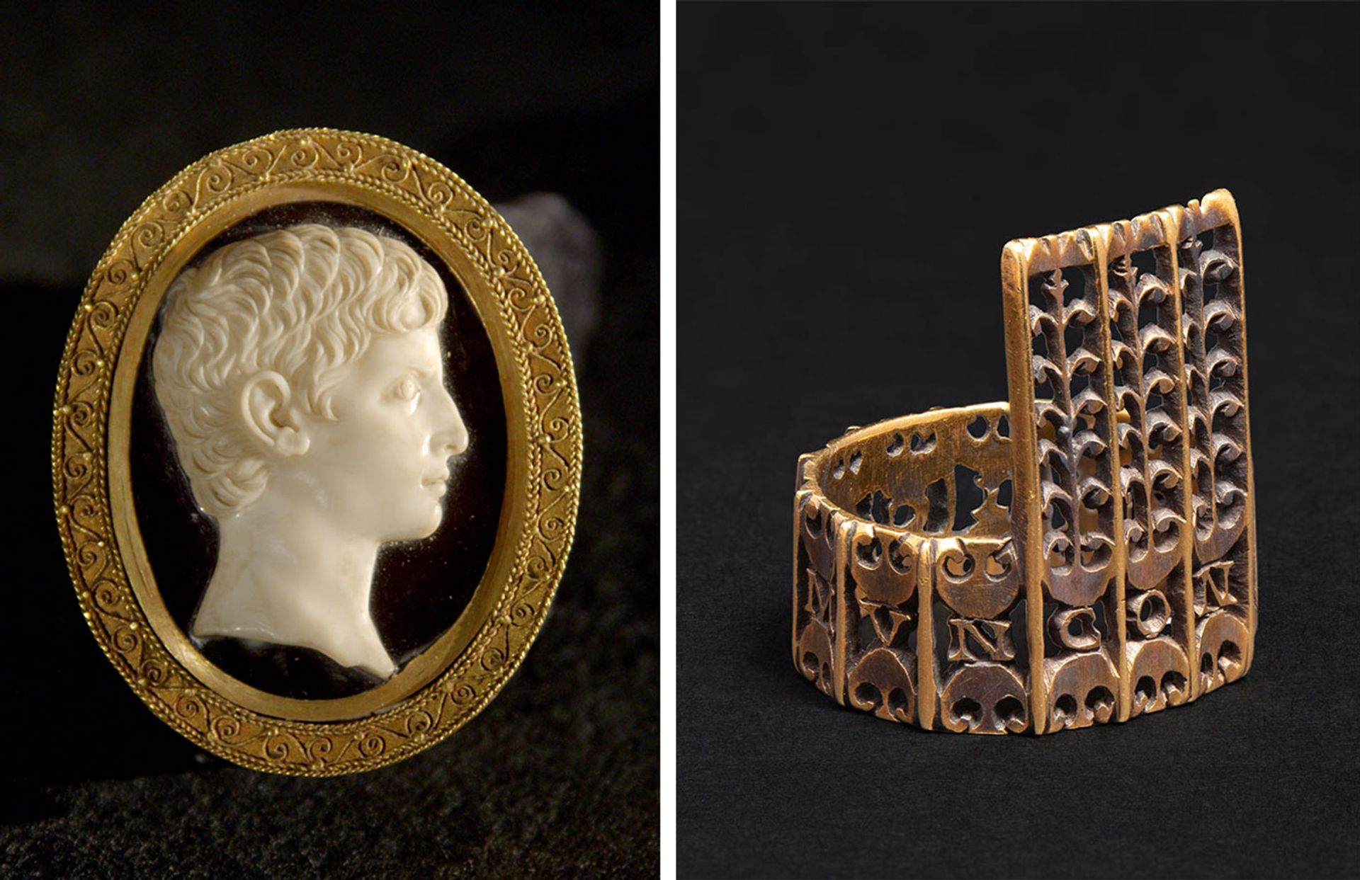 Two exceptional antiquities from the Treasury section opened at Waddesdon in 2019: a 1st-century cameo of Augustus Caesar’s grandson, Gaius, and a 2nd-century openwork gold engagement ring excavated in Tienen, Belgium. Photographs: Waddesdon Image Library, Mike Fear