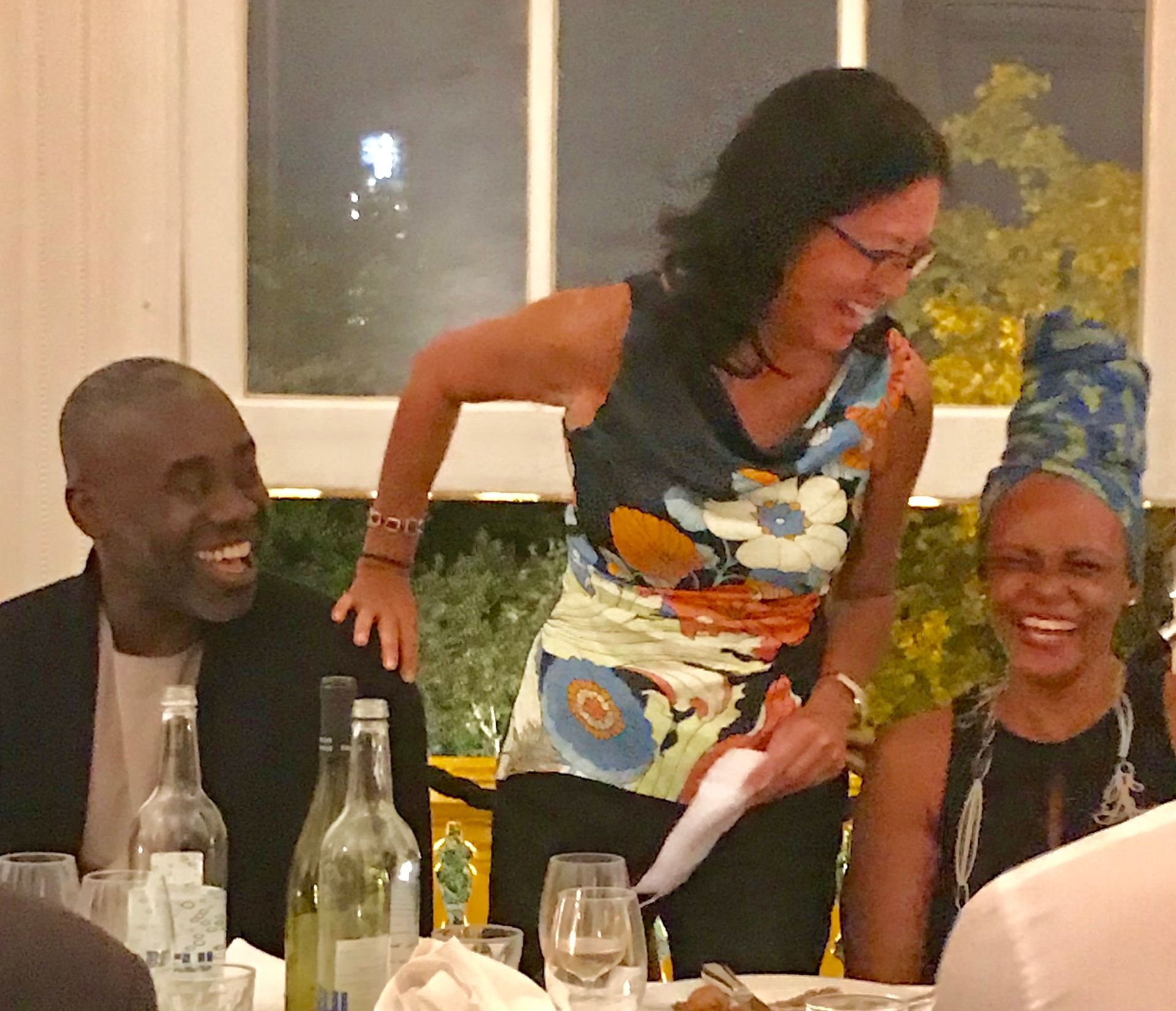 Chris Ofili (left) with David Zwirner director and Affinities curator Angela Choon (middle) and Jasmine Thomas-Girvan (right) at a dinner hosted by the gallery at the ICA Courtesy of Louisa Buck