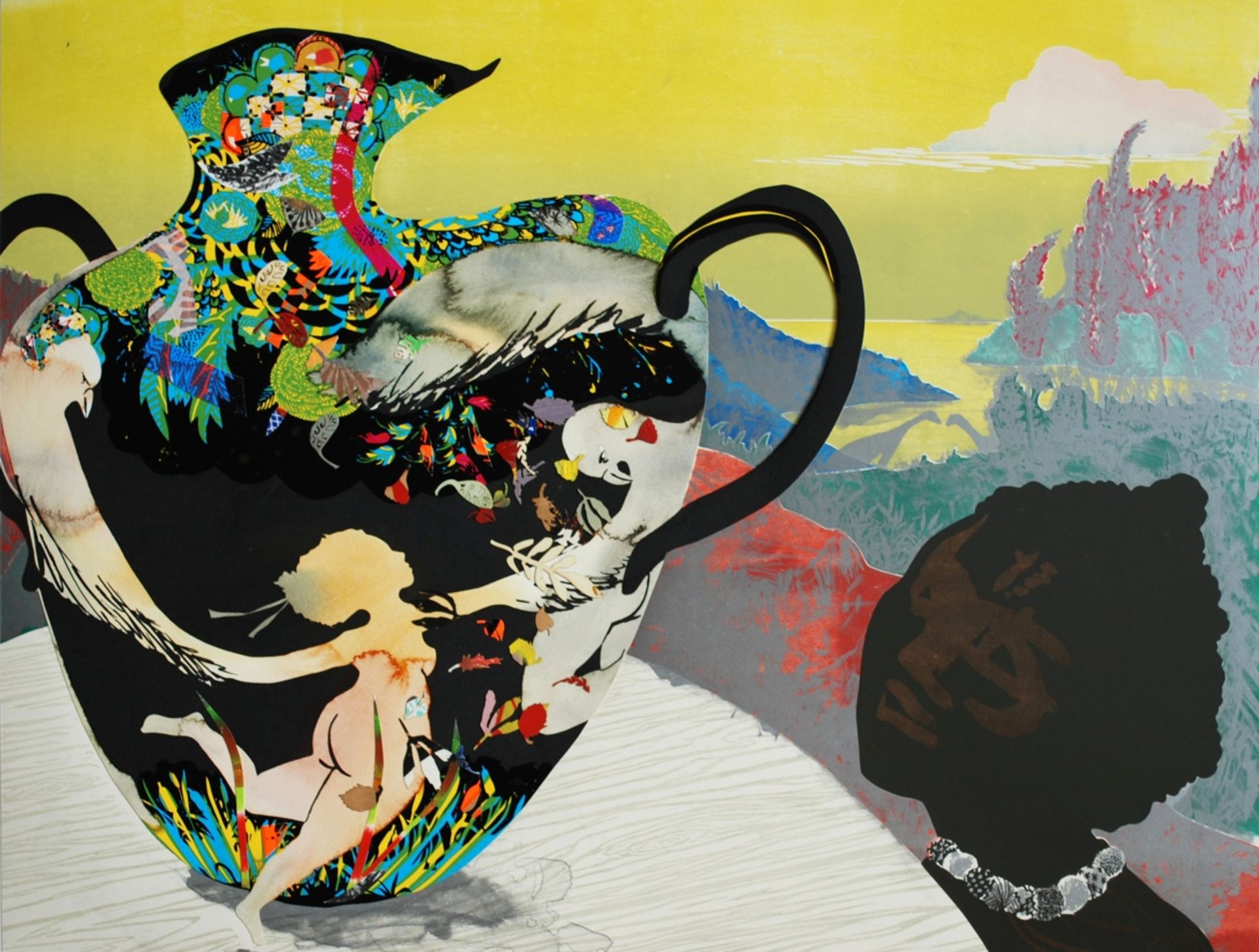 Among the more recent works is Floating World: The Pasts They Brought With Them (2013), a paper collage with silkscreen and hand colouring by Sanford Biggers that evokes scattered remnants of history and African-American quilt-making traditions. Paula Wilson’s Remodeled (2007), a relief woodcut with offset lithography, silkscreen, collaged elements and hand colouring, testifies meanwhile to complex layers of histories and cultures.