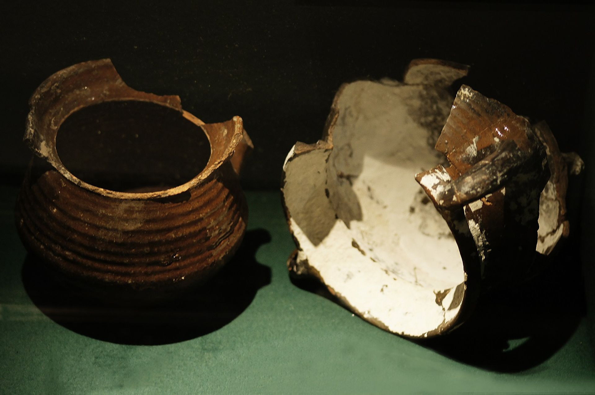 The two stoneware pots that were found in 1997 in Rembrandt’s cess-pit, with remnants of painting materials on the inside Courtesy of Amsterdam, Archeologische Dienst and the Rembrandt House Museum