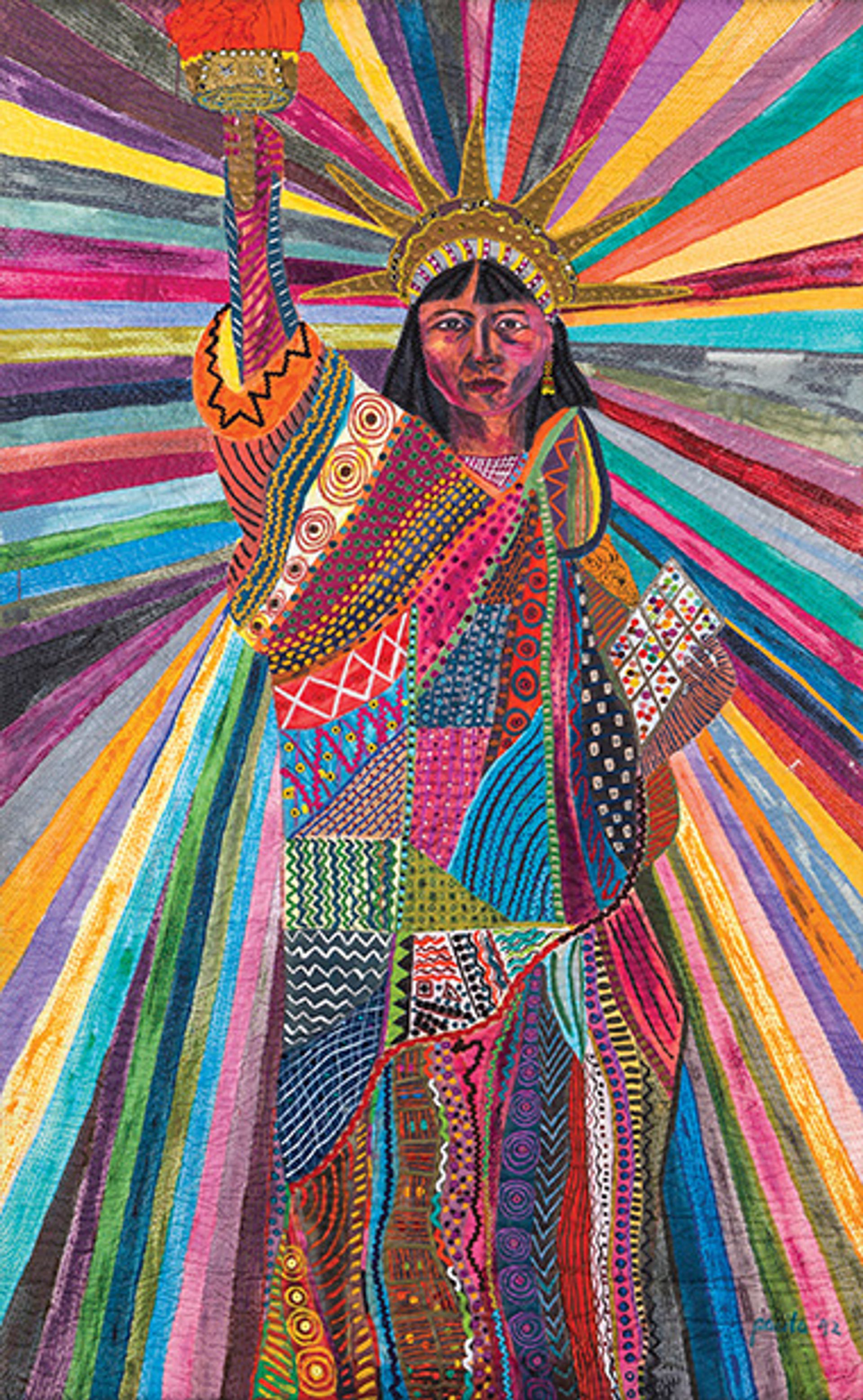 L.A. Liberty (1992) by Pacita Abad depicts the Statue of Liberty as a woman of colour and draws on Abad’s experience of leaving the Philippines for the US. Her work, priced from $60,000 to $75,000, is being shown by Silverlens Galleries from Manila © Estate of Pacita Abad