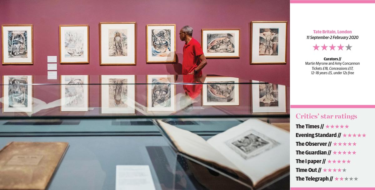The intention of Tate’s substantial Blake survey is to show us the artist in his own time, as a product of specific circumstances. In places, we are to look at the work as Blake’s contemporaries might have looked at it. A partial reconstruction of the exhibition of 1809 is attempted, with daylight effects plunging some of Blake’s darkest paintings into stygian gloom, occasionally interrupted by projections showing the more brilliant colours the works originally might have possessed. There is an excellent commitment to show Blake’s work as it originally came to an audience, not just in framed works hanging on a wall. People would have bought Blake’s engravings after different artists, or original works; would have read printed books with his engraved illustrations, original or otherwise; would have bought the luxurious and densely idiosyncratic illuminated books, turning the pages very carefully. They would have seen his work as part of miscellaneous exhibitions at the Royal Academy and other institutions, or, if very lucky, in a solitary display in 1809.