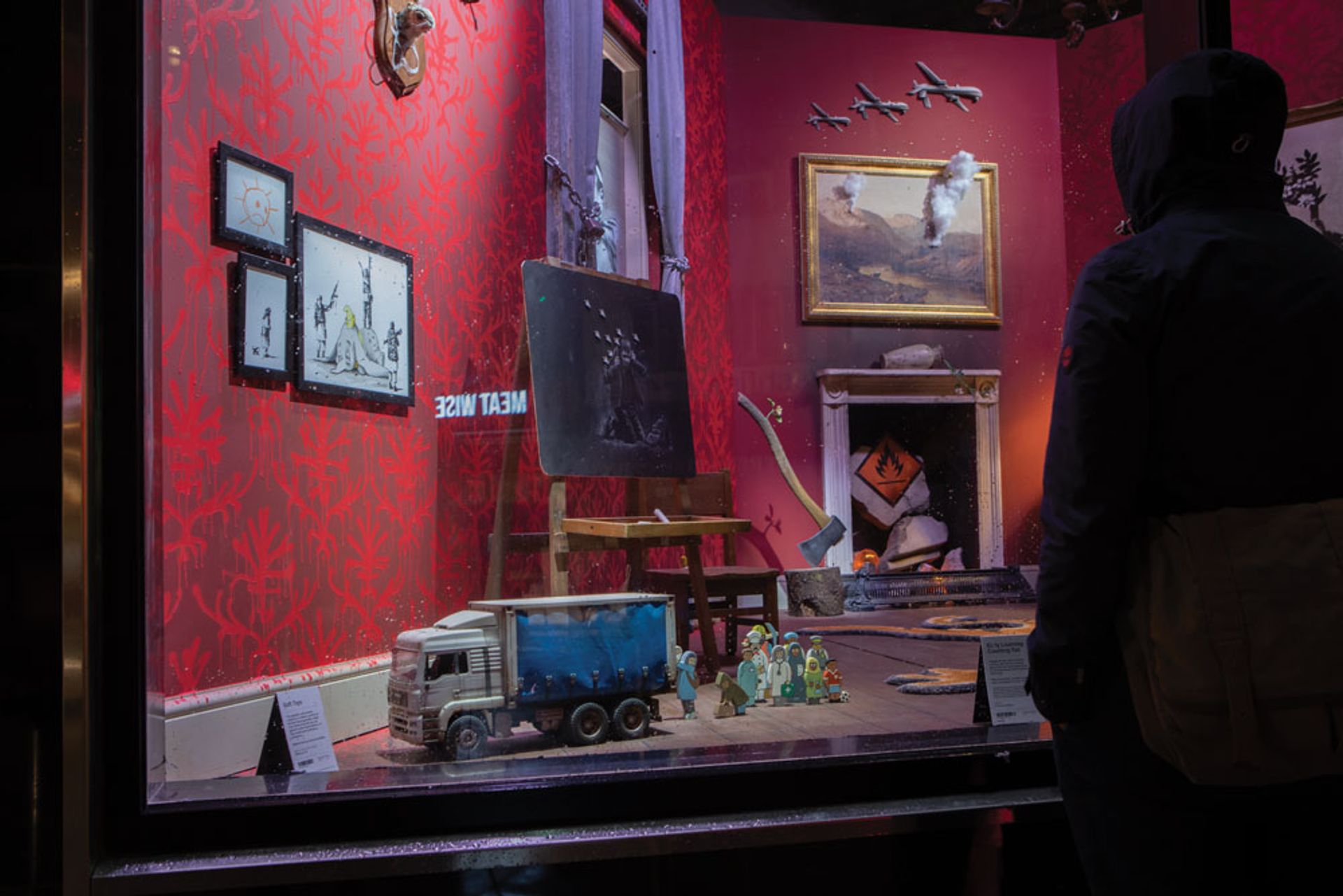 The homeware store, called Gross Domestic Product—essentially a window display that will never actually open—is selling a range of items, including the stab vest worn by the grime artist Stormzy at Glastonbury, welcome mats hand-stitched by women in detainment camps in Greece and disco balls made from police riot helmets. The objects have all been installed in a series of window displays along with often-reproduced paintings such as Banksy’s Flower Thrower.
