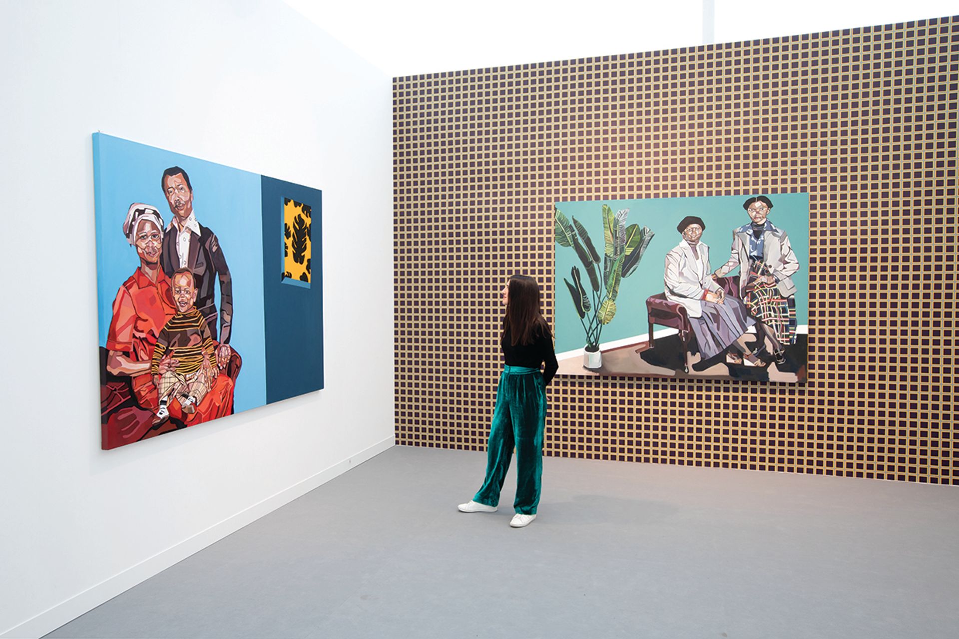 Joy Labinjo, Tiwani Contemporary: Unsurprisingly, Joy Labinjo’s paintings sold quickly. At just 24, Labinjo has developed a distinctive painterly language that has led to a solo show at Baltic, Gateshead, opening later this month. The works here are based on family photographs she recently discovered, from which she makes collages that lead to the paintings, where figurative elements sit amid abstract passages of pure colour. The figures and their clothes are captured in patches of colour, breaking their unity and gently distorting their form. Labinjo explores her British-Nigerian identity but also emphasises the elusiveness of memories conjured through images. David Owens