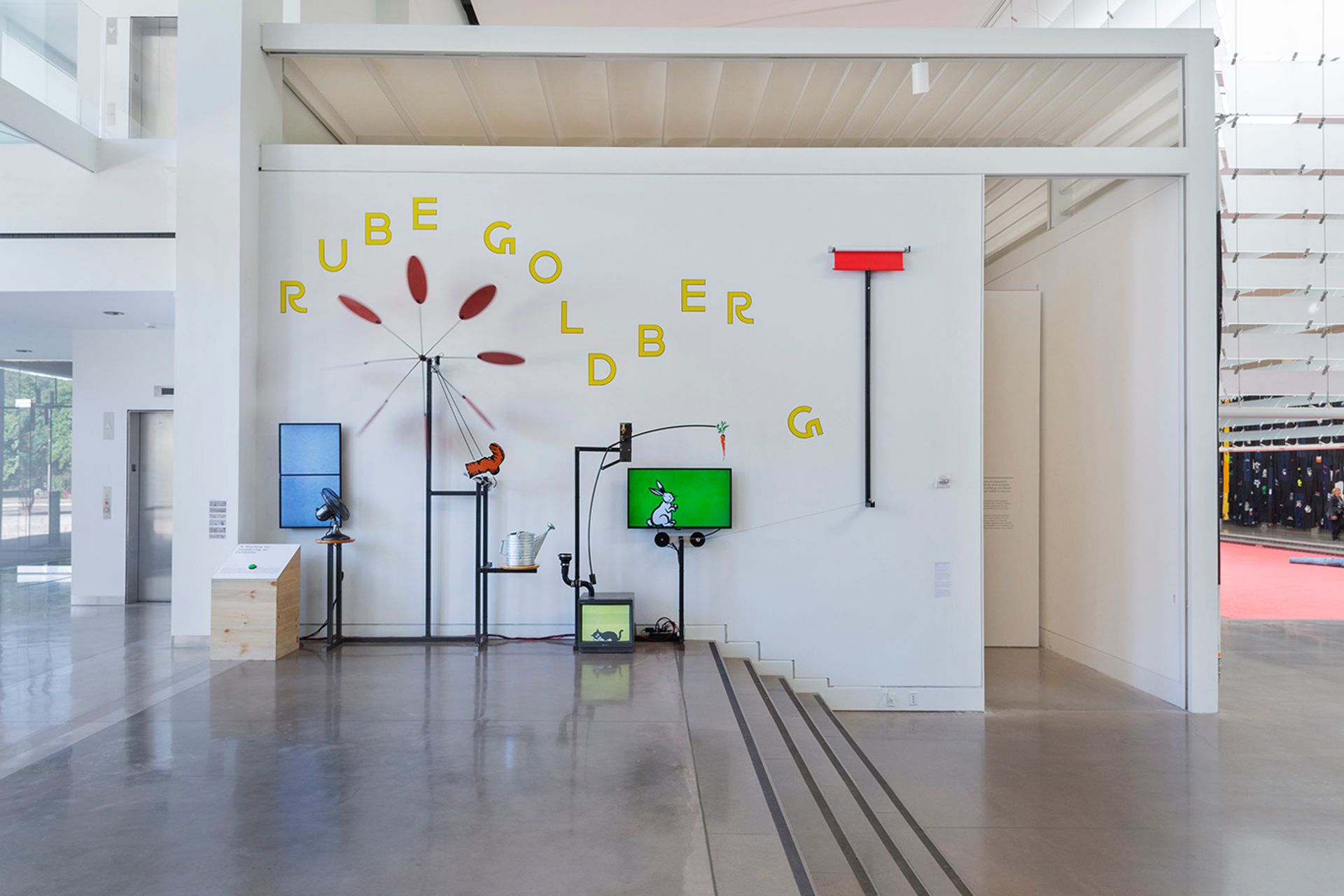First the user presses a big green button. An animated bird flies on a flat screen, which then triggers a real electric fan that blows on a pinwheel and activates a boot through a motor. The boot kicks over a watering can, which leads to a video of a cat leaping up and triggering yet another physical reaction. (And so on.)