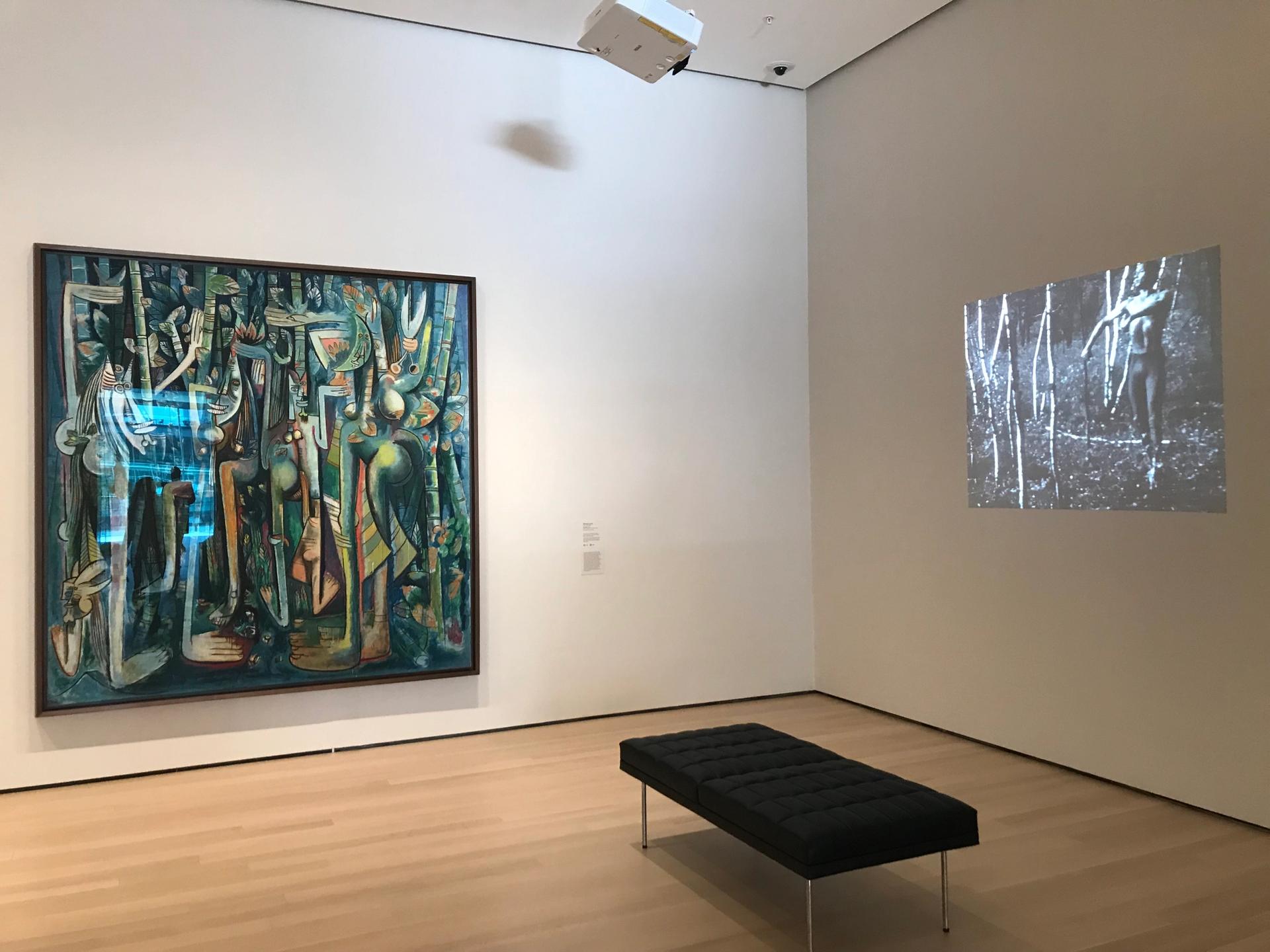 Wifredo Lam’s painting The Jungle (La Jungla) (1943) hangs next to Maya Deren’s film A Study in Choreography for Camera (1945) in the gallery Out of War, filled with 20th-century works by artists displaced by war © Photo: Helen Stoilas, The Art Newspaper