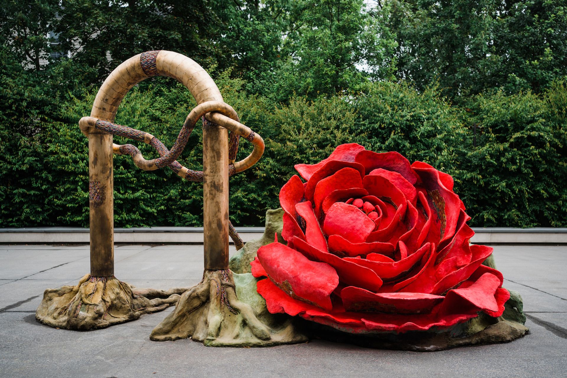 The exhibition also includes one site-specific sculpture called Flowers and Roots (2019) that Sime created with seven students from Hamilton College using repurposed computer parts, electrical wire, bronze sheeting and cast stones. The work, in which a colossal flower appears to bloom from the pavement, was inspired by the Saunders peonies—a hybrid flower developed at the school in the 1950s by the late chemistry professor Percy Saunders. “These peonies, which were in bloom when we first visited the school, were manipulated by humans through meddling with natural processes,” says the anthropologist and Sime's collaborator Meskerem Assegued. “Machines, which humans are so connected with and addicted to nowadays, are the same as the flowers: a man-made material once extracted from the earth that takes a different meaning and form once it’s been manipulated by humans.”