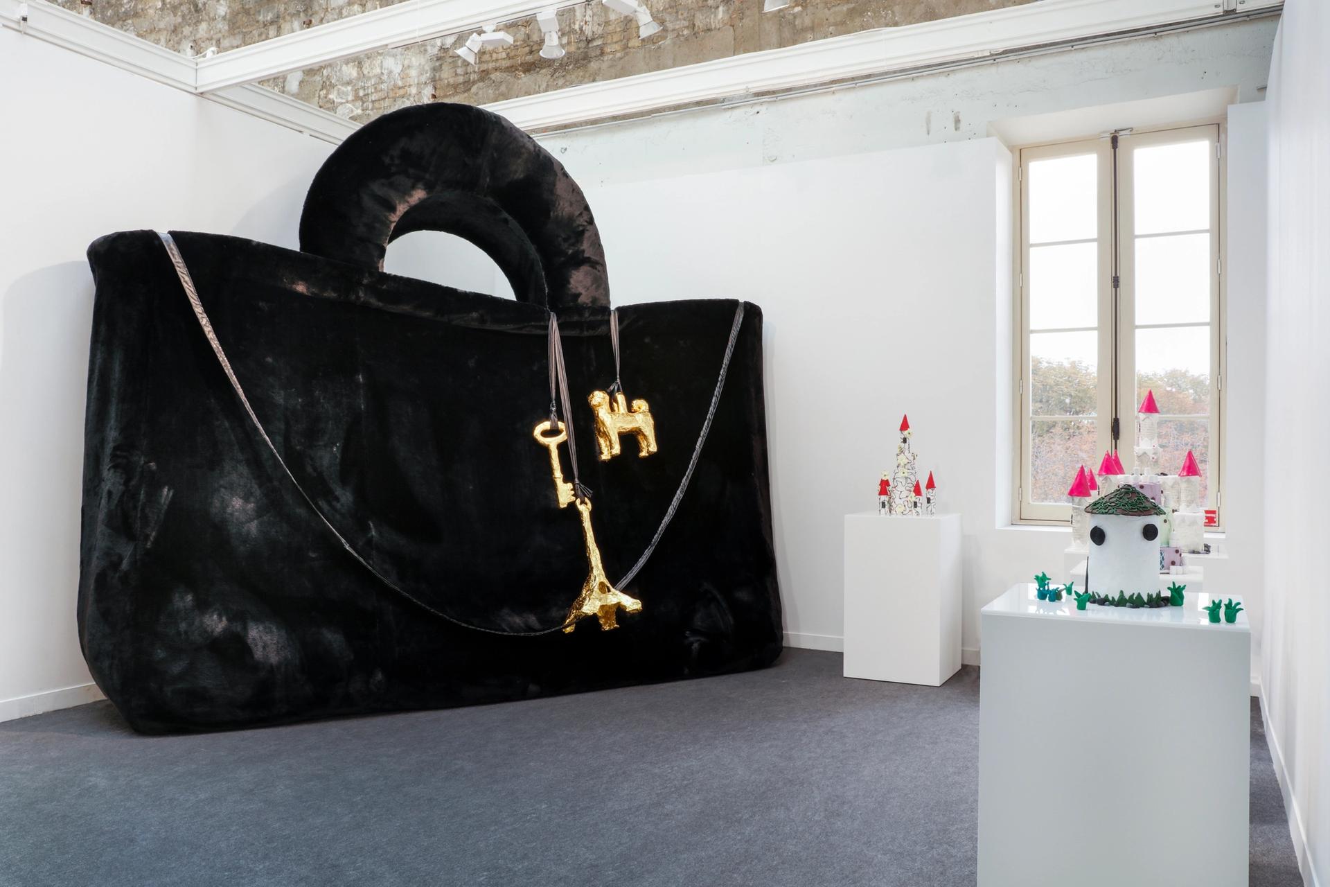 “As I’m new to the fair, I don’t have a specific market in mind. A lot of my US collectors have turned up.” The booth includes a range of sculpted pieces and installations by Gina Fischli, including The Roberta (2019; €30,000), a five-metre wide faux fur purse adorned with ginormous trinkets such as a gold-leaf Eiffel Tower. Smaller castle and house models made of fimo clay by Fischli are priced at €3,500 each.