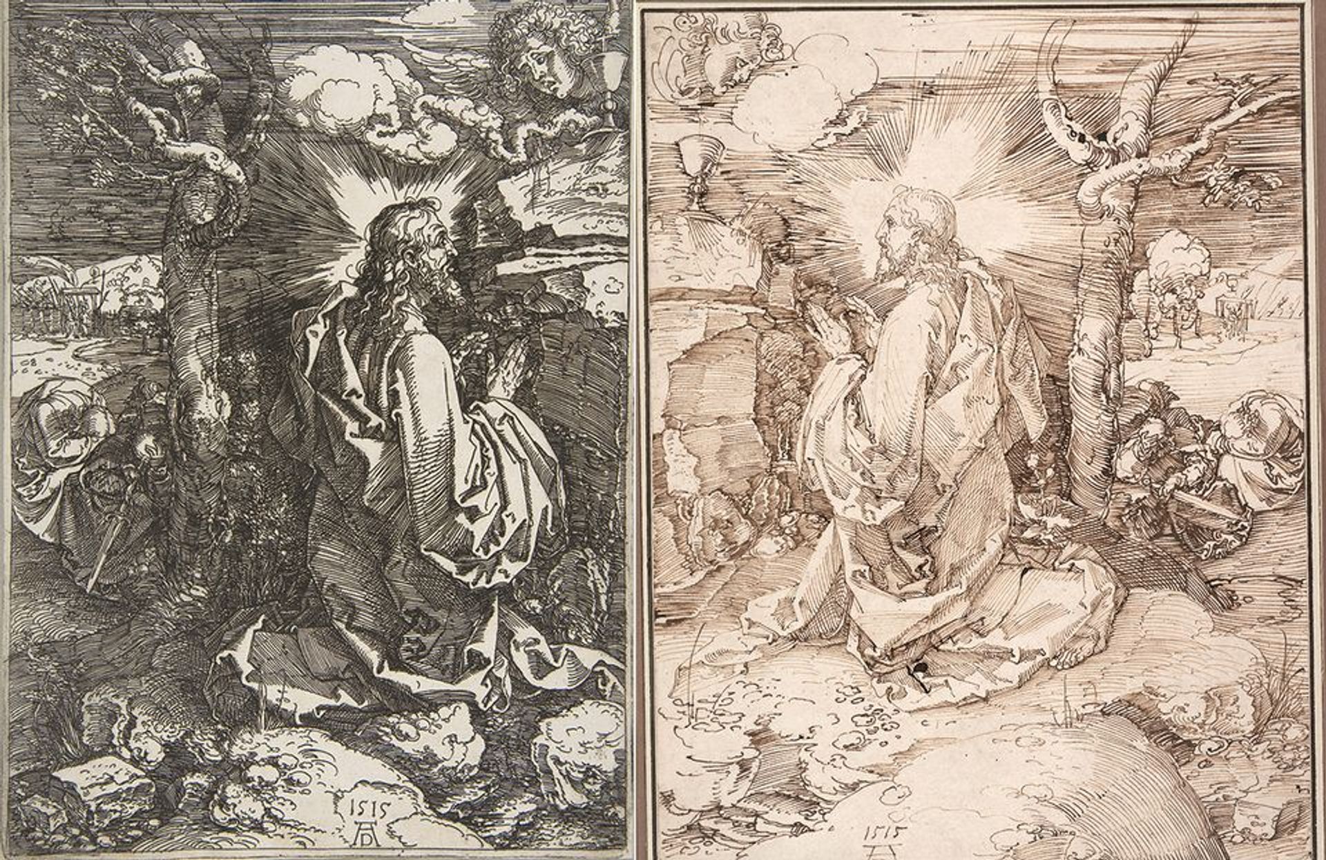 Albrecht Dürer's Agony in the Garden (1515) as an etching, left, and drawing © The Albertina Museum, Vienna (Peter Ertl and Olga Pohankova)