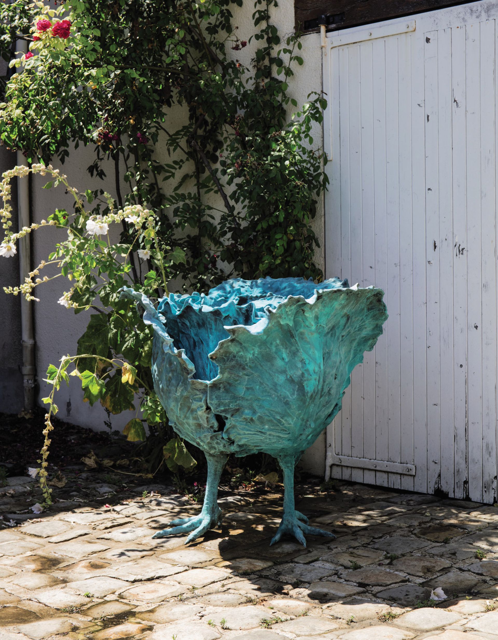 Giant cabbages on chicken legs, oversized gingko leaf table tops, sheep settees. Husband-and-wife duo François-Xavier and Claude Lalanne had a flair for fusing flora and fauna into delightful yet functional works that defied the minimalist austerity of mid-century art and design. He produced large animals with storage or seating uses; in 1966, his “herd” of 24 bronze and wool sheep became his trademark. She combined plants and animals to whimsical ends, often coating organic matter with copper to natural effect; her Man with a Cabbage Head was featured on a Serge Gainsbourg album cover in 1976.