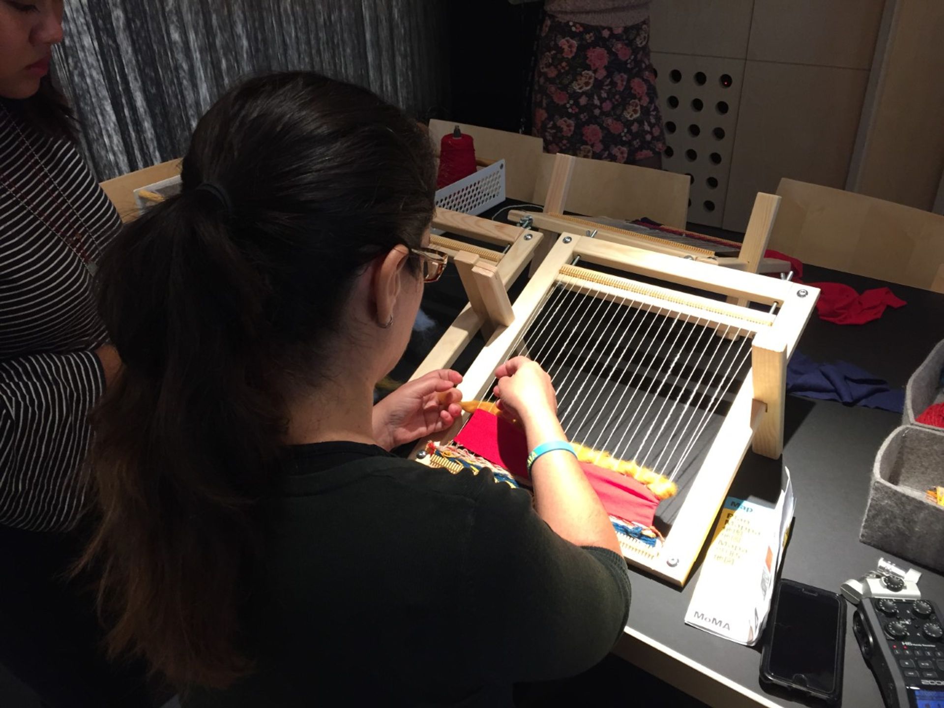 A visitor threading material onto a loom in the Museum of Modern Art's Creativity Lab Nancy Kenney