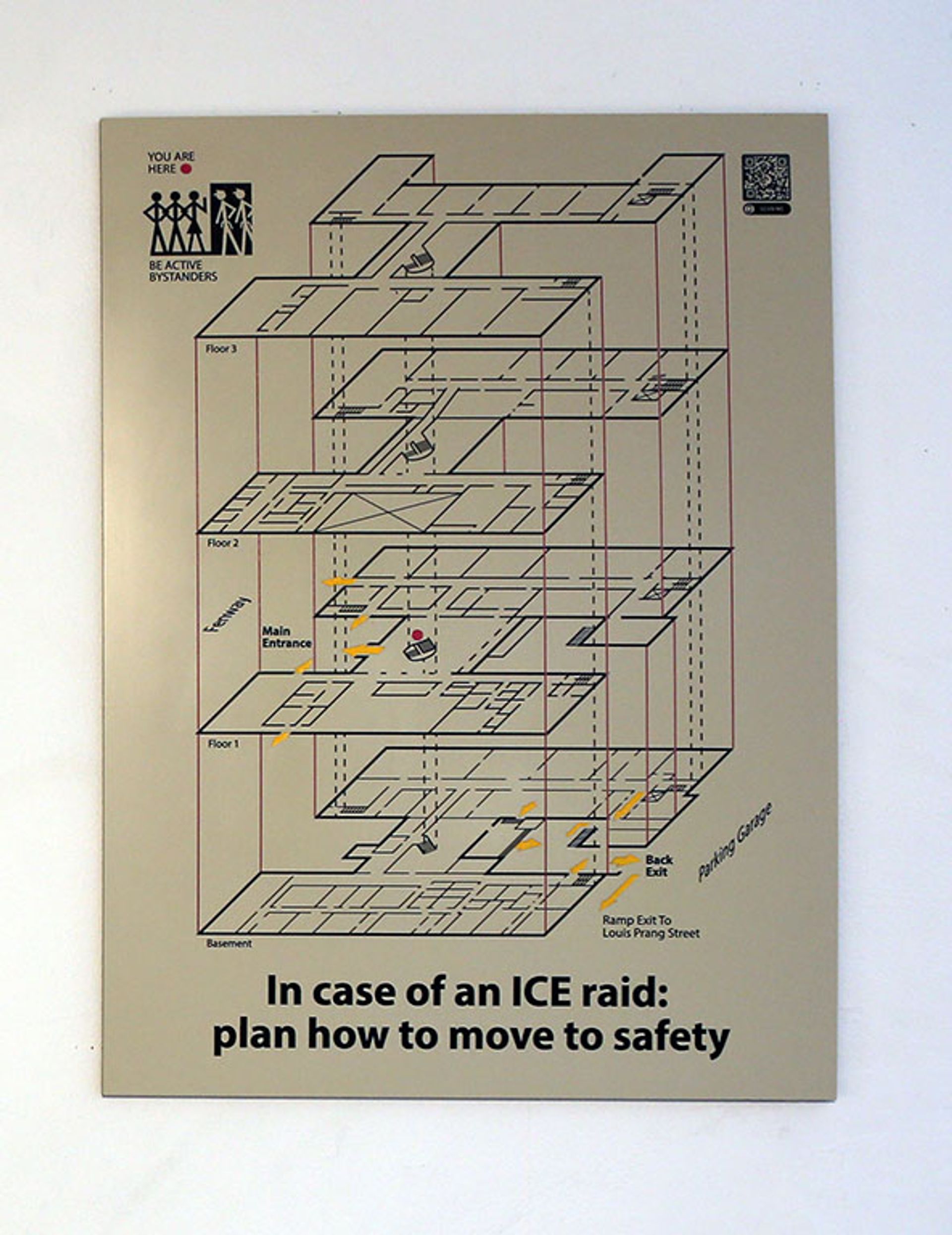 A few miles away underneath a busy stairwell at the School of the Museum of Fine Art (SMFA) at Tufts, a commissioned intervention by Jenny Polak plants viewers in the middle of a raid by Immigration and Customs Enforcement agents in diagrams with a “You are Here” reminiscent of fire evacuation signs. The text invites us to evaluate our status (hunted or safe) and to choose how to respond, and then specifies the most direct routes to sanctuary from the SMFA.