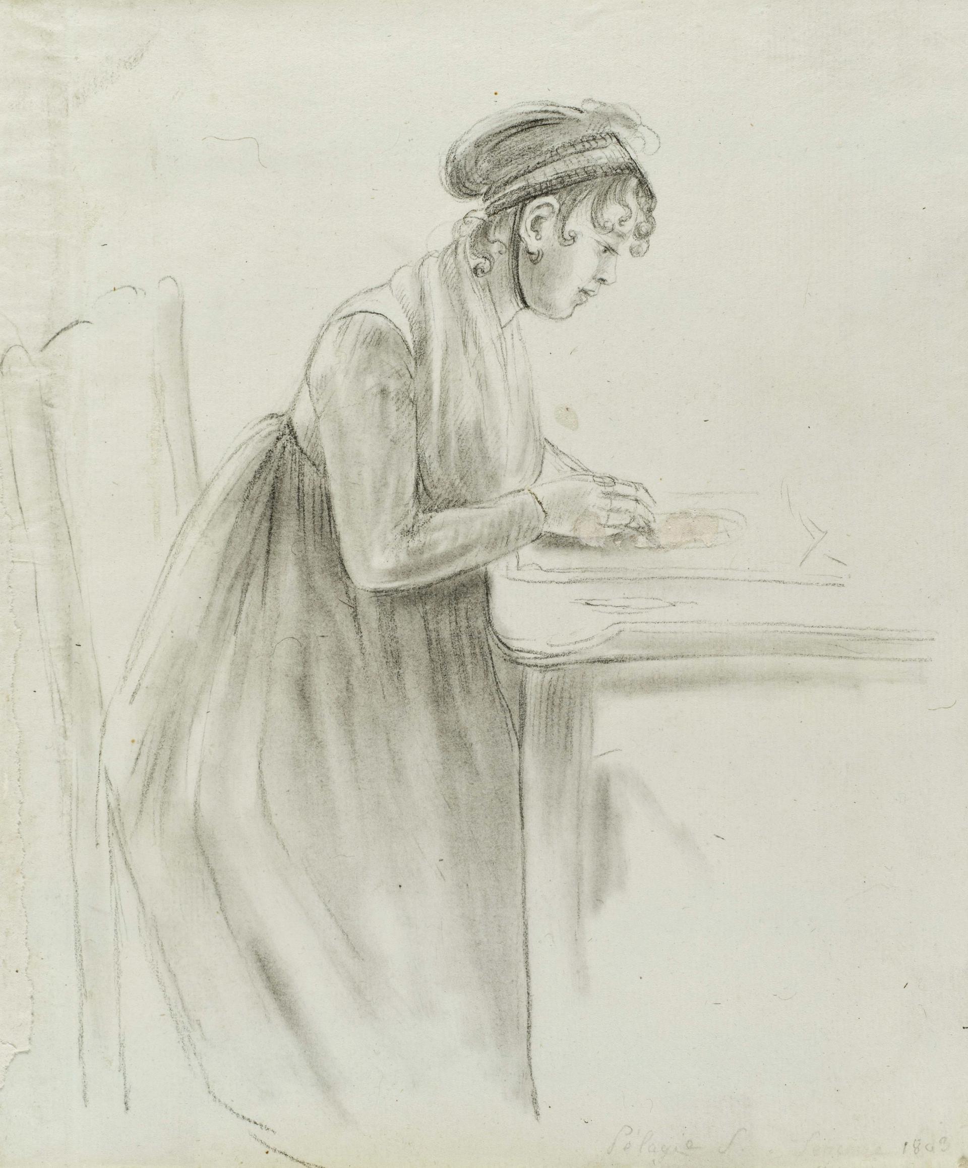 Anne Marguérite Joséphine Henriette Rouillé de Marigny, Baroness Hyde de Neuville, Pélagie Drawing a Portrait, from the Economical School Series (1808) New-York Historical Society