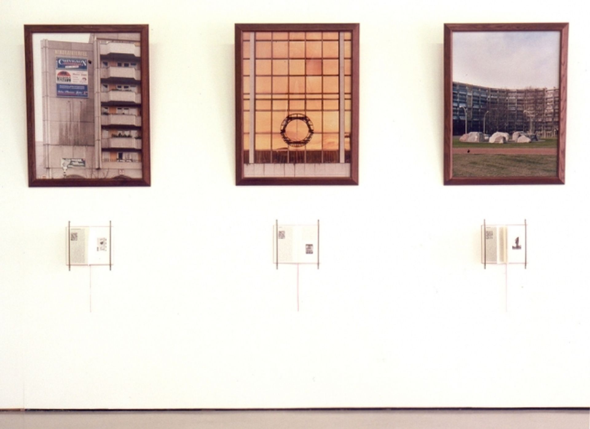 The French artist Sophie Calle (b 1953) investigated the disappearance of GDR memorials and state symbols in her 1996 series, “The Detachment”. She photographed the empty sites where these political symbols once stood and then asked residents and passers-by to describe and share their memories of them. The resulting historical witnesses’ accounts were often radically different. The centre photograph above shows where the emblem of the GDR had been removed from the windows of the now-demolished Palast der Republik.