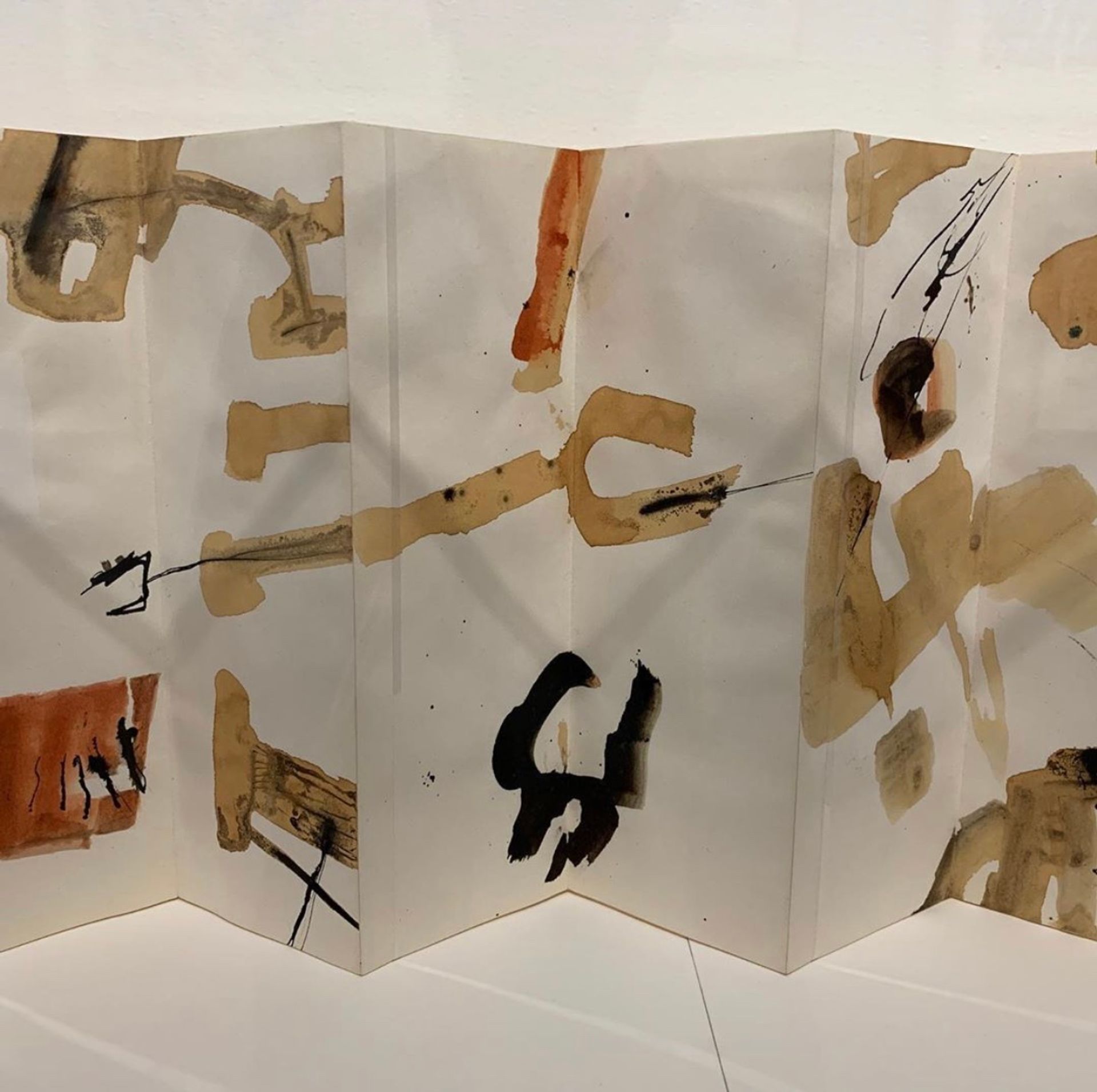 “Adnan started to work on painting in 1960s, creating leporellos [book-format works with folded pages]. It is an extraordinary composition that is not just painting but writing. It is a very intimate language that you can unfold; it occupies the space,” Lista says. Adnan, who was born in Beirut in 1925, was until a few years ago primarily known for her writing (her 1977 novel Sitt Marie-Rosewon the France-Pays Arabes award). Her contribution to Documenta13 in Kassel in 2012 made her an art world star, bringing her small, abstract canvases to new, appreciative audiences. Adnan creates works in a small studio in her Paris apartment, using a palette knife to apply the paint on the canvas. Etel Adnan, Untitled (1960)