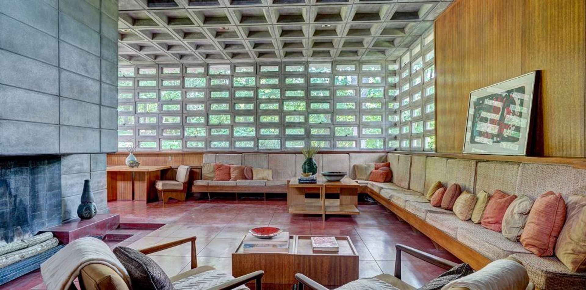 Like other Usonian Automatic houses, the two-bedroom, 1,400-sq.-ft home was designed by Wright with a gridlike masonry building system of stacked, individually cast rectangular concrete blocks. In its dramatic living room, 350 windows framed by concrete allow light to pour in, reflecting the architect’s philosophy of clean Modern design for the middle class.