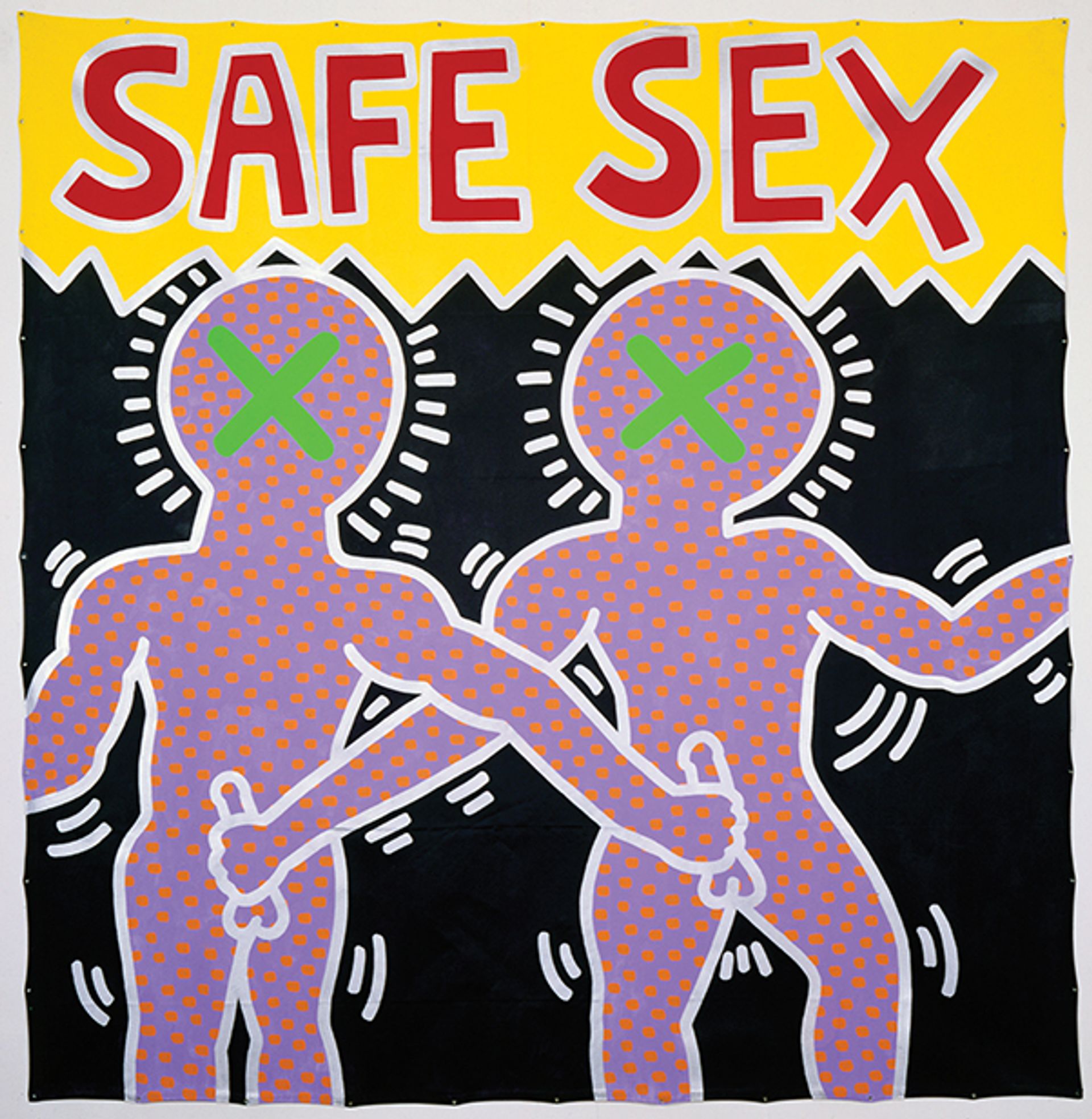 Safe Sex was created by Keith Haring in 1985, at the height of the Aids crisis; the artist, who began his career as a street artist in New York with drawings on the city’s subway, himself died in 1990 of an Aids-related illness © Keith Haring Foundation