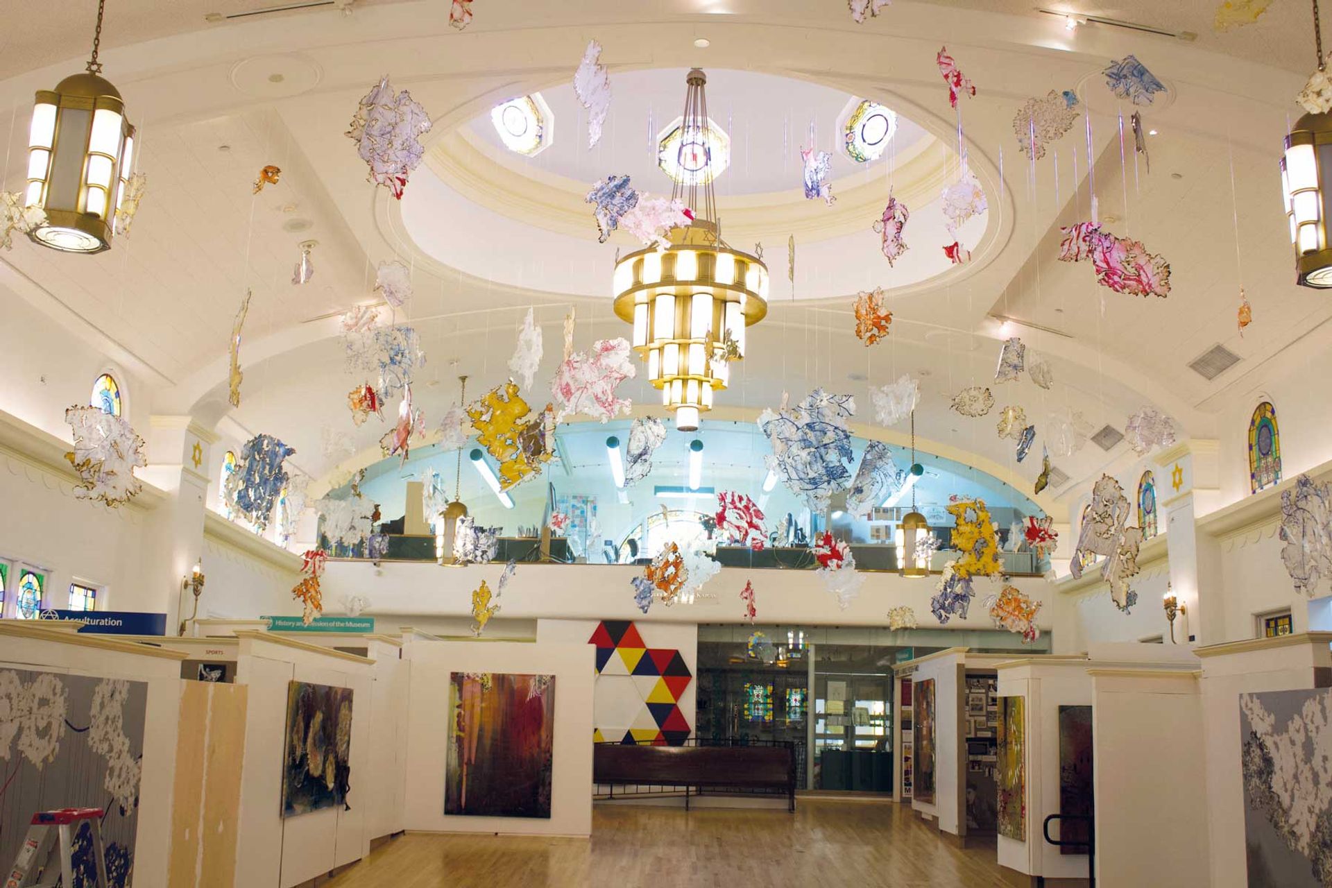 The local artist and self-described “eco-feminist” Mira Lehr brings a bit of the outdoors indoors in her immersive exhibition at the Jewish Museum of Florida-FIU. Suspended from the ceiling of the former synagogue are 180 coloured resin sculptures that reference seven species of plant mentioned in the Torah. It was the 85-year-old artist’s first ceiling commission and she relished the challenge: “The museum has these gorgeous stained-glass windows and the way the sunlight comes in through them and plays off the sculptures is breathtaking,” Lehr says. “It’s almost as if the ceiling is dancing. I’ve watched people become mesmerised as the pieces move in the air currents.” Accompanying the ceiling sculptures is a display of ten new paintings created using one of the artist’s favourite materials: gunpowder.