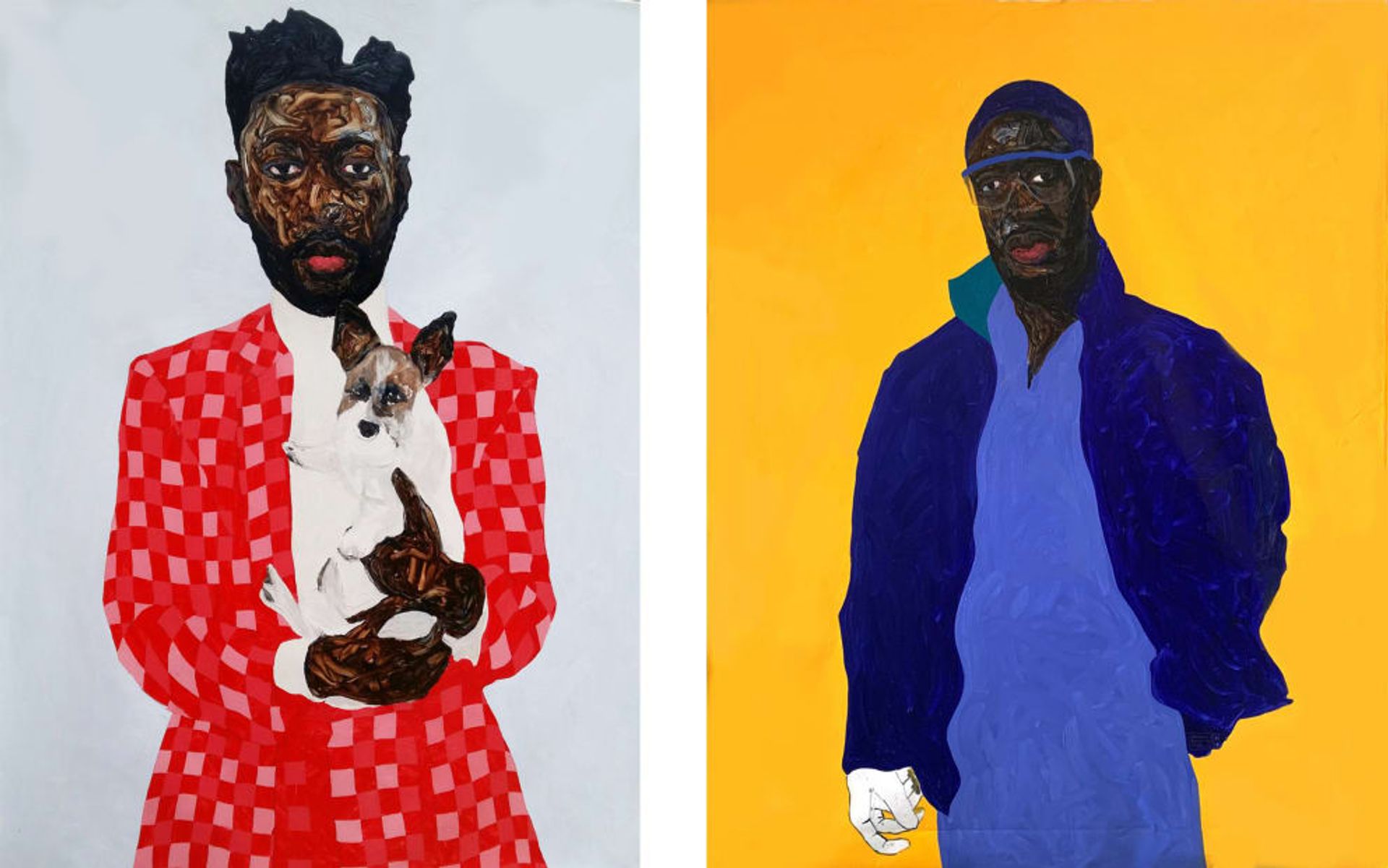 (Left) Amoako Boafo, Hudson Burke and Benedita Furacao, 2018. (Right) Amoako Boafo, Steve Mekoudja, 2019. Courtesy of Mariane Ibrahim Gallery, Chicago.
