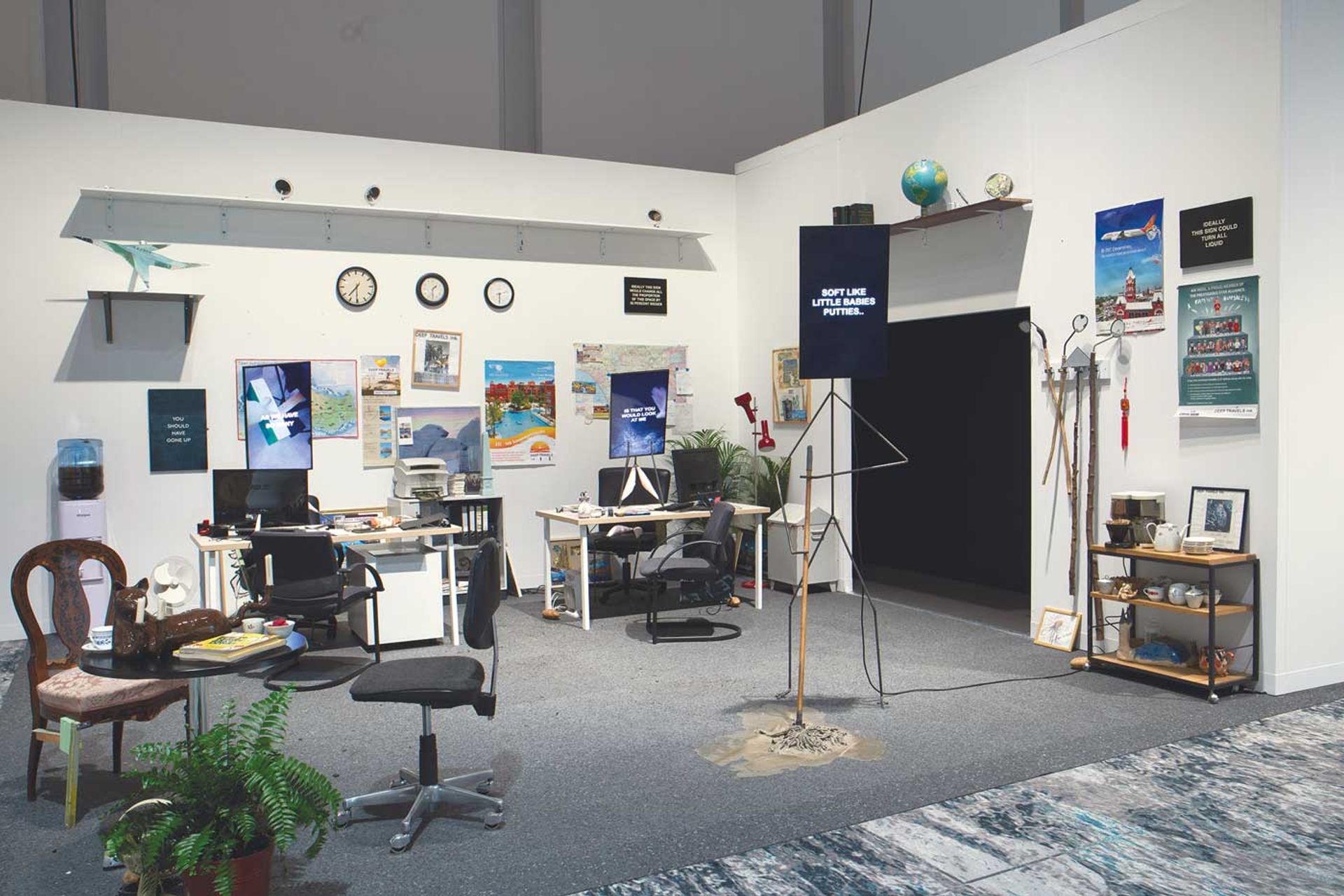 At Art Basel in Miami Beach for its inaugural Meridians section, she is presenting DEEP TRAVEL Ink (2016-ongoing), a “pseudo-functional” travel agency that is part of her fictional family business, iterations of which were previously shown in Frankfurt and New York. According to her gallery, Lisson: “This hypnagogic environment replete with water coolers, palm trees, fans, people working at desks, as well as a waiting area conflates time and space, rendering any concrete or psychic destination tantalisingly uncertain.”