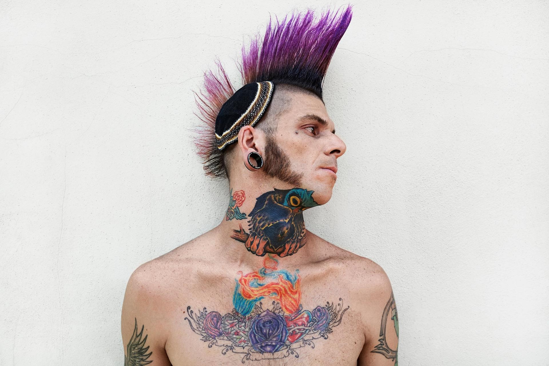 “I’m crashing back into my identity,” Zachary Balber says of the impetus behind his photography exhibition at the Jewish Museum of Florida. After narrowly avoiding a prison sentence and recovering from addiction, Balber found kinship with other Jewish men dealing with substance abuse issues. Those friends became the subjects of his latest series of photographs, which documents the aesthetic of counter-cultural Jews who sport elaborate tattoos, rocker mohawks and muscles like Rambo. Balber infuses these images with both humour and respect. “I asked them to wear the yarmulke that I was bar mitzvahed in,” he explains, saying it’s a reminder of both a high power and the annoyance of keeping the religious hat on one’s head.