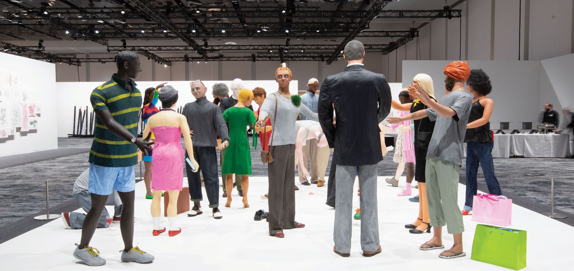 Twenty-six life-size figures dressed for a swanky metropolitan bash are greeting visitors at the entrance of Art Basel in Miami Beach’s new Meridians section. The installation by Tom Friedman is a joy for film fans who might see some familiar faces among the Styrofoam mannequins. Co-presented by Stephen Friedman Gallery and Luhring Augustine, Cocktail Party (2015) features characters ranging from an aging waiter to an oddly-matched-but-embracing couple. Nearby is a pair of red slippers à la Dorothy Gale and what appears to be a tableau from the classic film, Breakfast at Tiffany’s, in which Audrey Hepburn lights a cigarette. It is like these pop cultural references have been put through a pithy blender. Is it a satire of the fêted Basel fairgoers? Party on, party people.