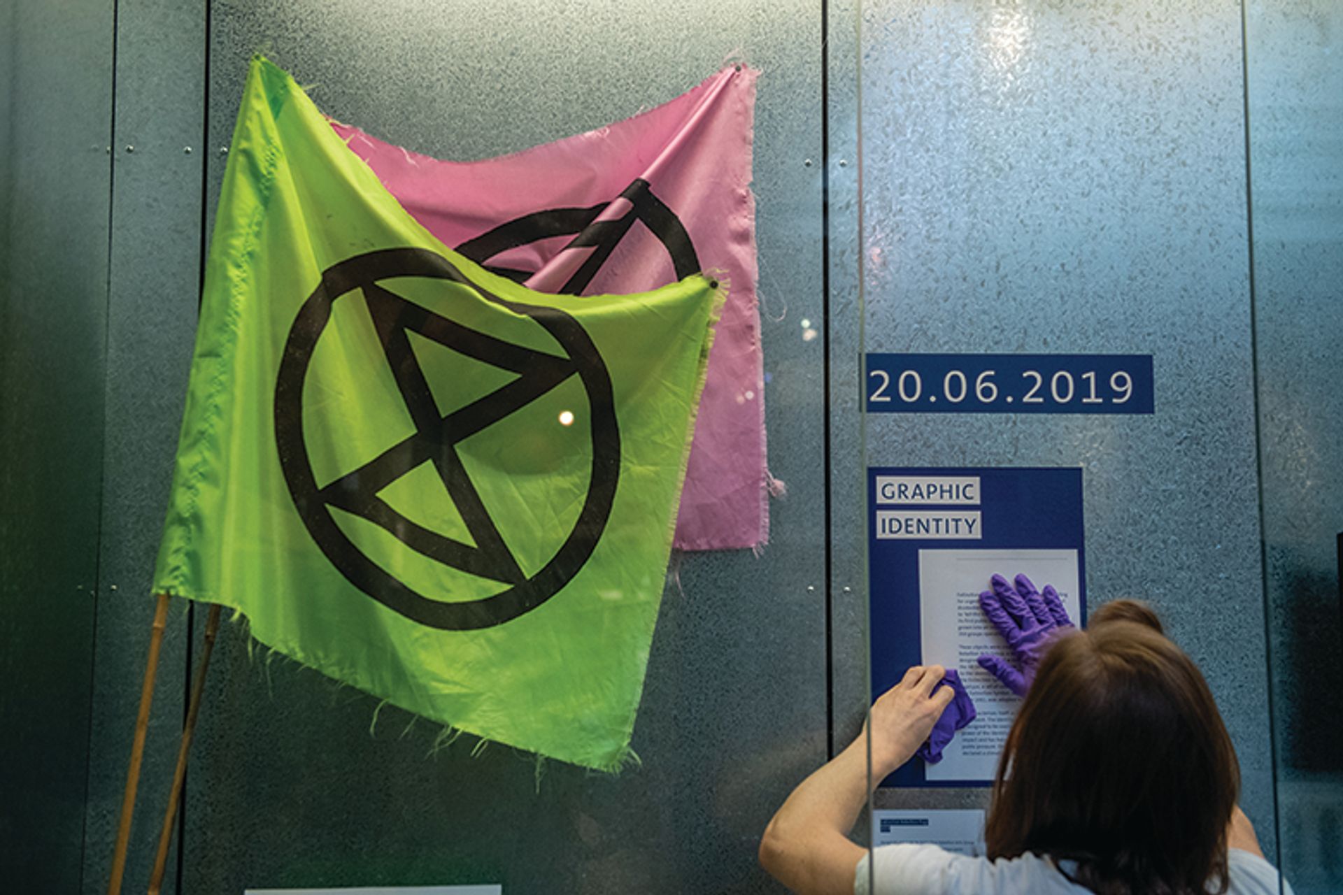 The V&A acquired digital graphics and printed protest materials produced by the climate change activists Extinction Rebellion. V&A curator Corinna Gardner said their “clear design principles have ensured their acts of rebellion are immediately recognisable”. The Victoria and Albert Museum acquired London Extinction Rebellion designs. Photo: © Chris J Ratcliffe