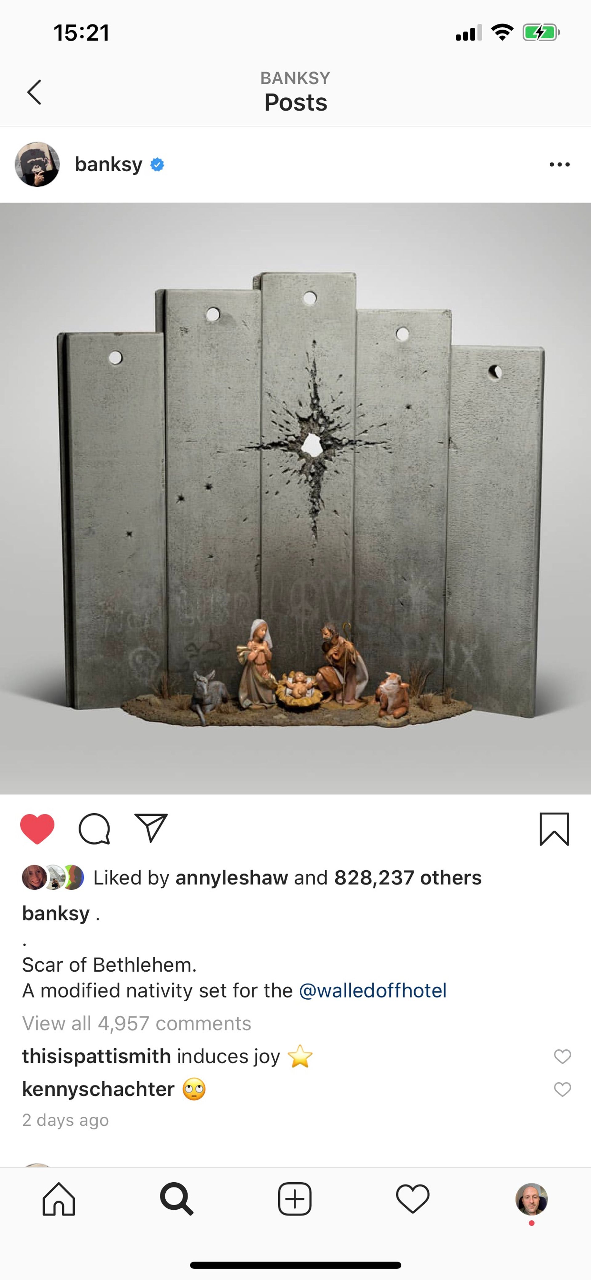 Meanwhile, on a festive note Banksy has posted on Instagram a nativity scene, which is on show at the Walled Off hotel in Bethlehem. The work, entitled The Scar of Bethlehem, depicts Jesus’s manger in front of the separation barrier in Israel which is emblazoned with a star-shaped dent.