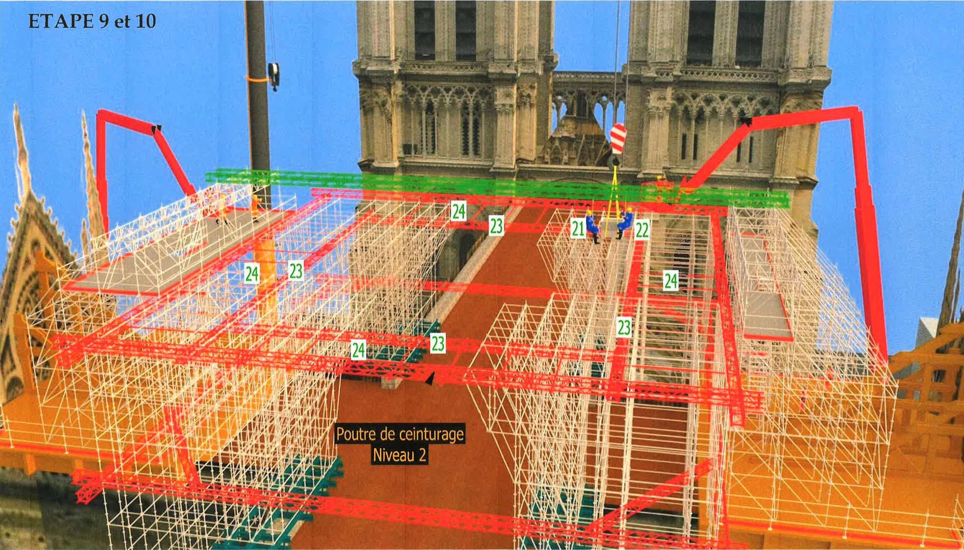 The state of the nave vaulting will now be assessed, and to speed this up, two temporary sliding roofs (parapluies roulants), one for the nave and one for the choir, will be installed over the wooden platform recently positioned above the vaults. The transept crossing presents particular difficulties because this is where the roof and the vaults completely collapsed during the fire, leaving parts of the roof beams hanging. These could fall down and further damage the building.