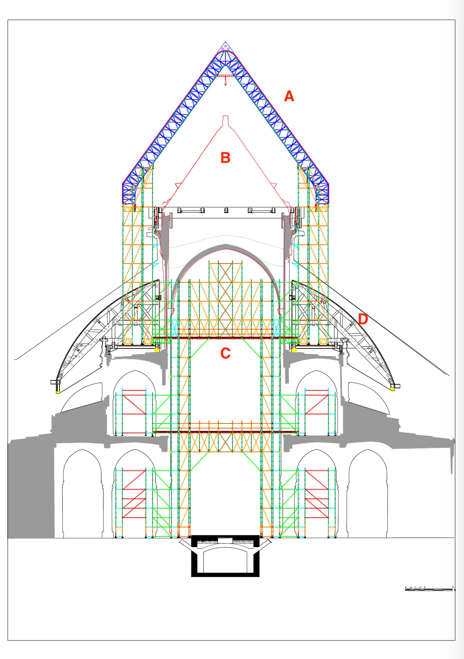 After the removal of the scaffolding, a new temporary roof called the “grand parapluie” (large umbrella) will be built over Notre Dame (A, see below), to allow the restoration of the vaults and the reconstruction of the roof (B). This is expected to take some years. Inside the nave, the choir and the aisles, temporary scaffolding (C) will allow restoration and reconstruction work to carry on. The structural reinforcements of the buttresses (D) will remain in place until the end of the restoration process. All these very important support structures should be in place by next September.